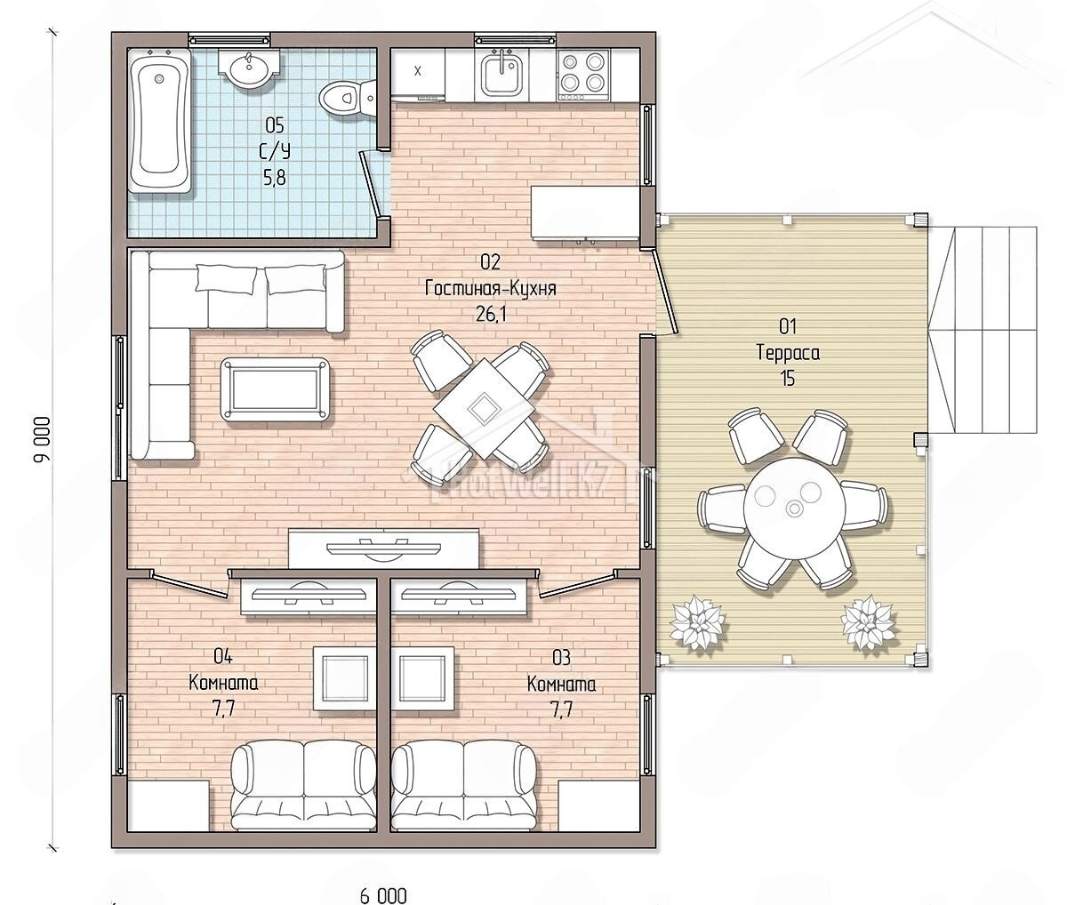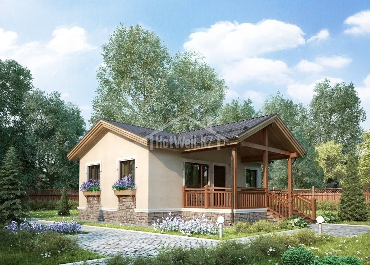 Одноэтажный дом 9 на 9 метров, общей площадью 69 м2, из СИП панелей, с террасой и спальней на первом этаже.
