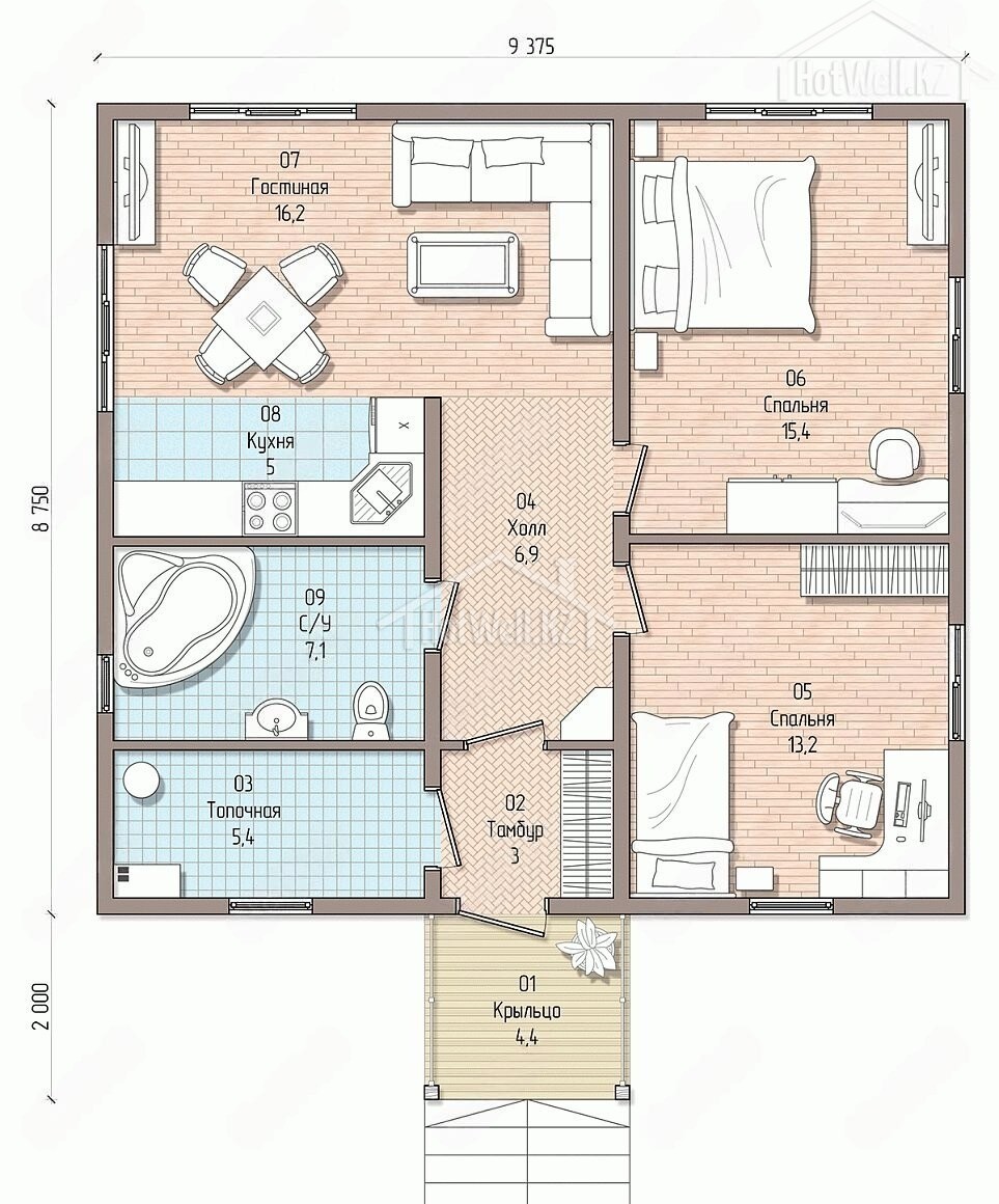 Внешние + внутренние несущие стены из СИП панелей Hotwell.KZ 158 мм (OSB-3 Толщина 9 мм, Пенополистирол ПСБ-С-20Ф)