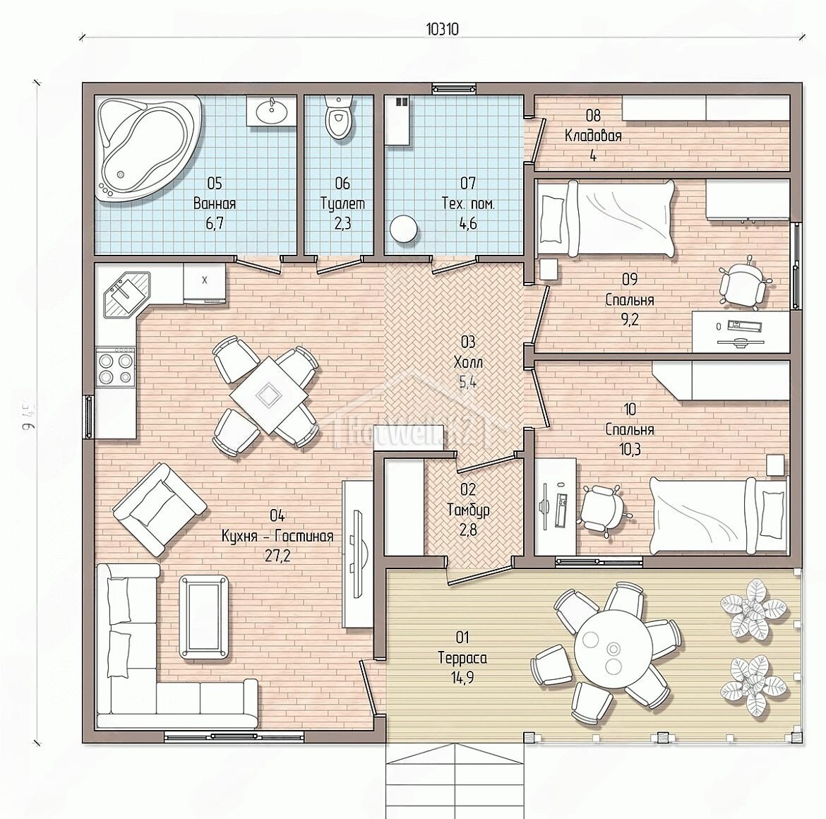 Одноэтажный дом 10 на 10 метров, общей площадью 97 м2, из СИП панелей, с бойлерной, террасой и спальней на первом этаже.
