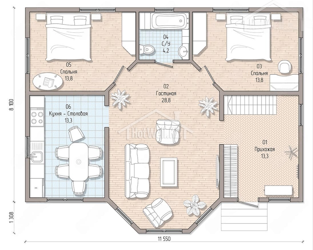 Внешние + внутренние несущие стены из СИП панелей Hotwell.KZ 158 мм (OSB-3 Толщина 9 мм, Пенополистирол ПСБ-С-20Ф)