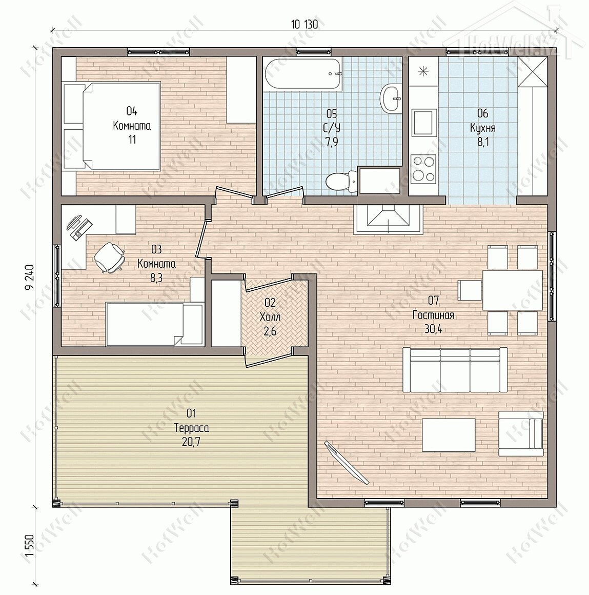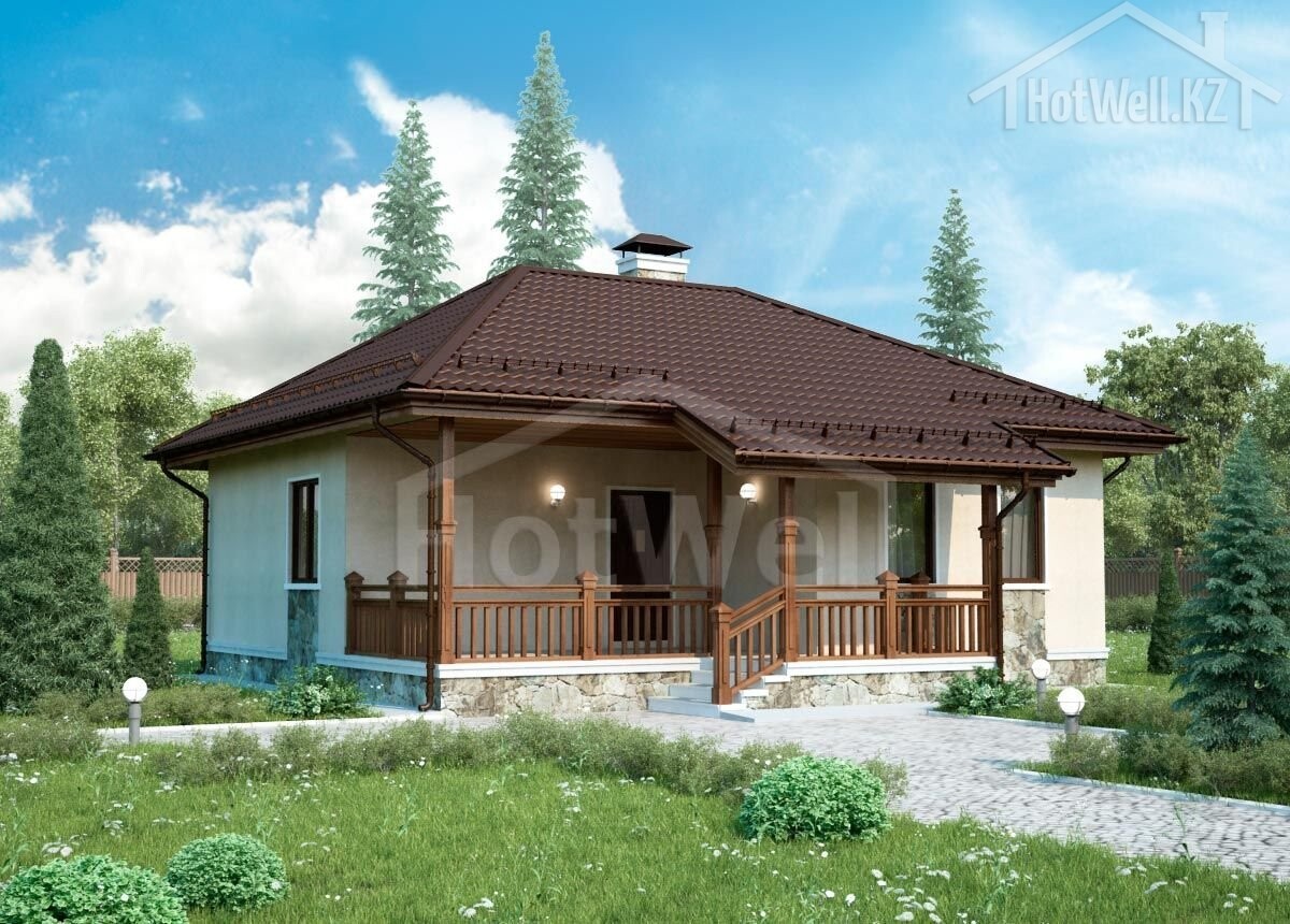 Одноэтажный дом 11 на 10 метров, общей площадью 99 м2, из СИП панелей, с террасой и спальней на первом этаже.