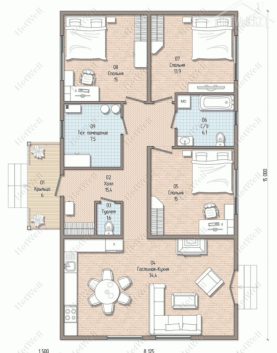 Одноэтажный дом 15 на 8 метров, общей площадью 127 м2, из СИП панелей.