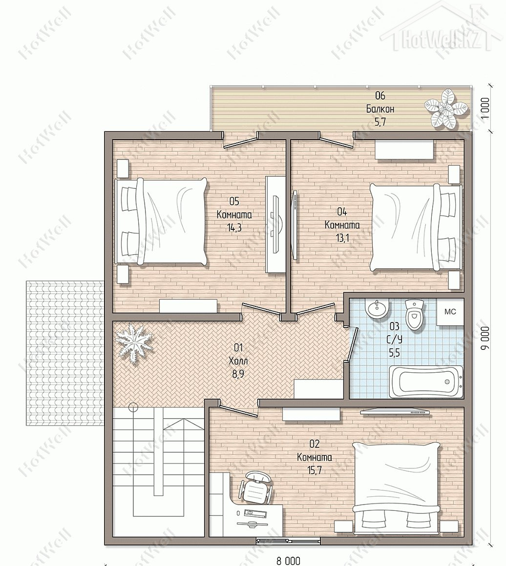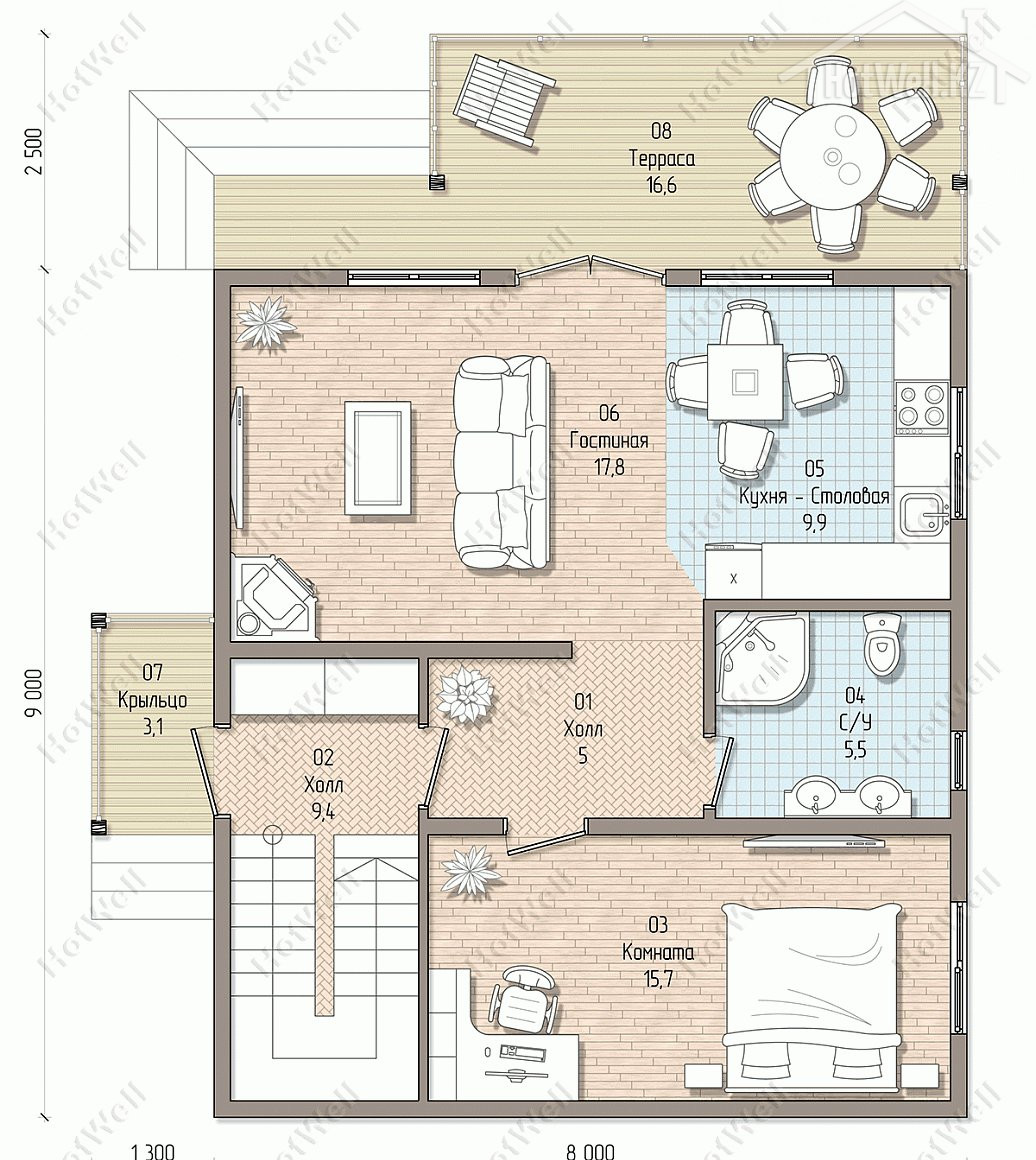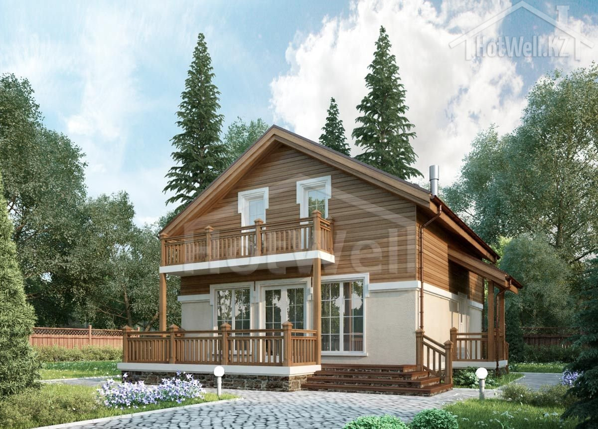 Дом с мансардой 12 на 9 метров, общей площадью 164 м2, из СИП панелей, с террасой, балконом и спальней на первом этаже.