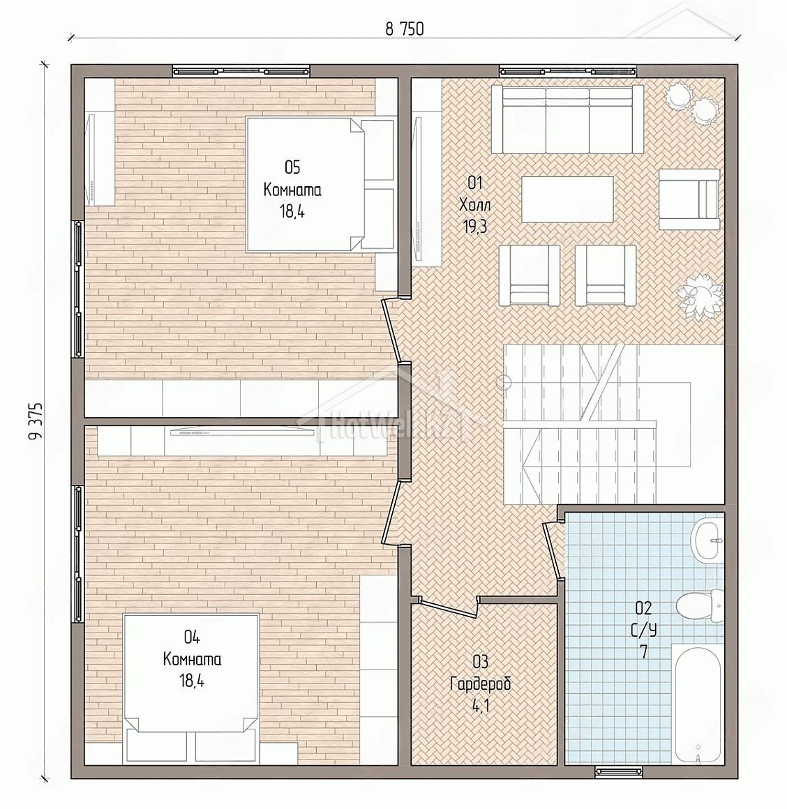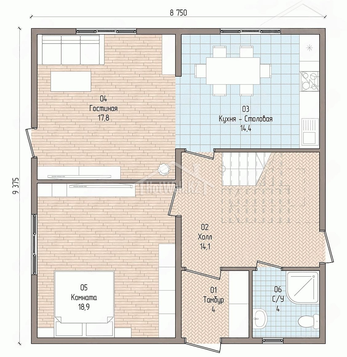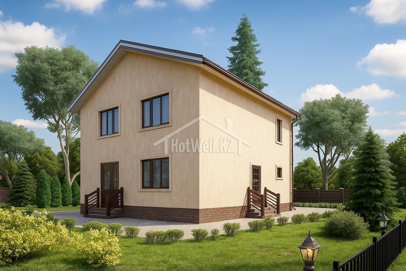 Двухэтажный дом 9 на 9 метров, общей площадью 164 м2, из СИП панелей, со спальней на первом этаже.