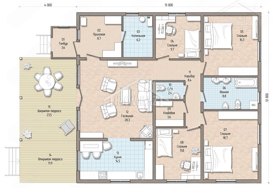 Одноэтажный дом 17 на 12 метров, общей площадью 195 м2, из СИП панелей, с бойлерной, террасой и спальней на первом этаже.