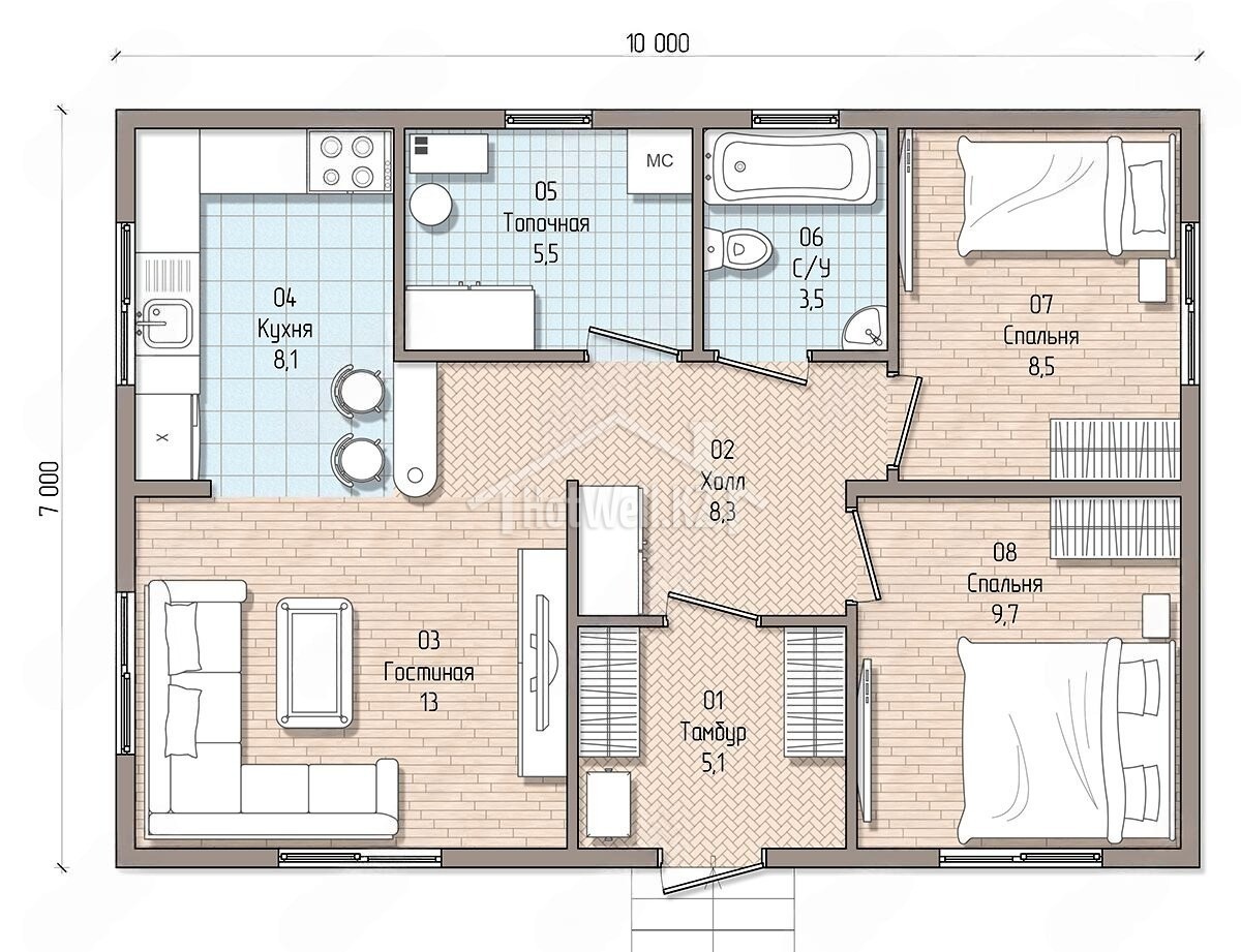 Одноэтажный дом 10 на 7 метров, общей площадью 70 м2, из СИП панелей, с бойлерной и спальней на первом этаже.