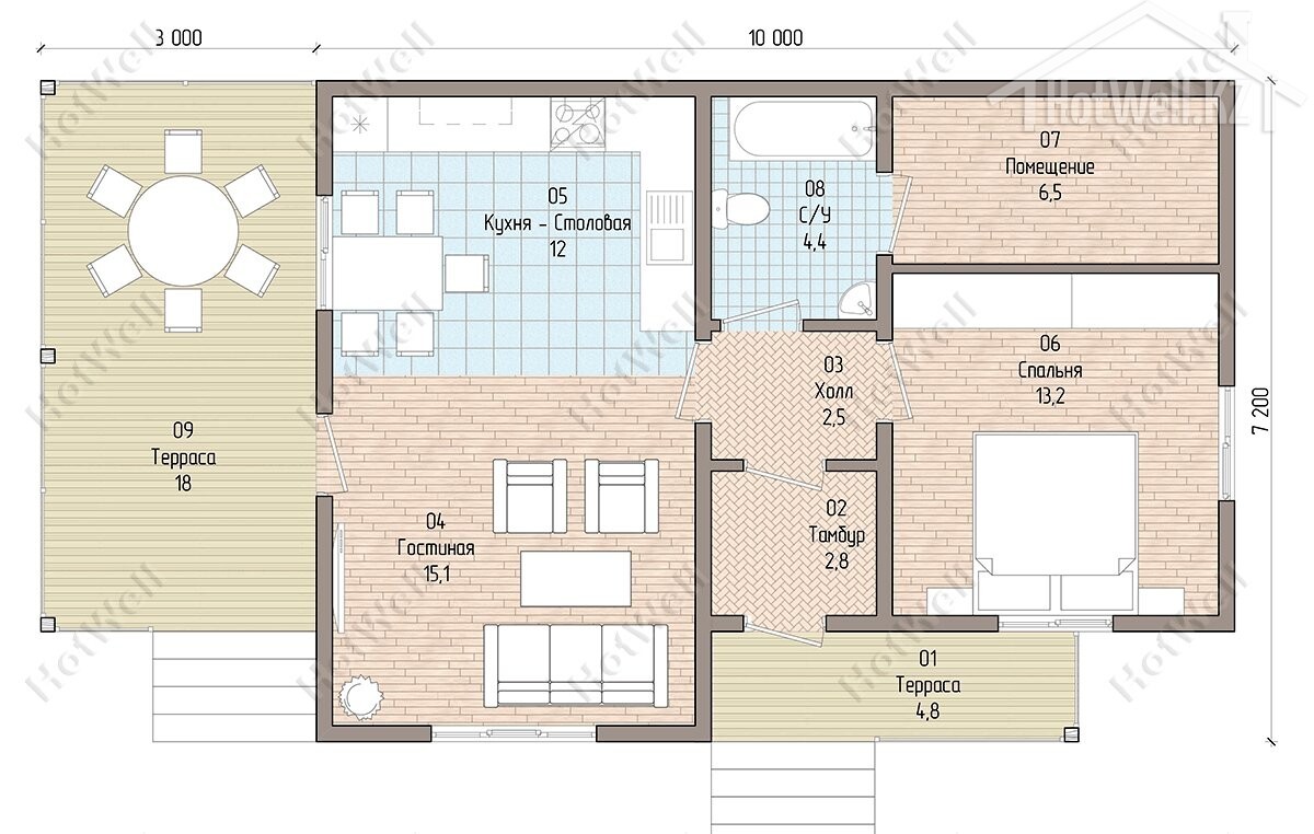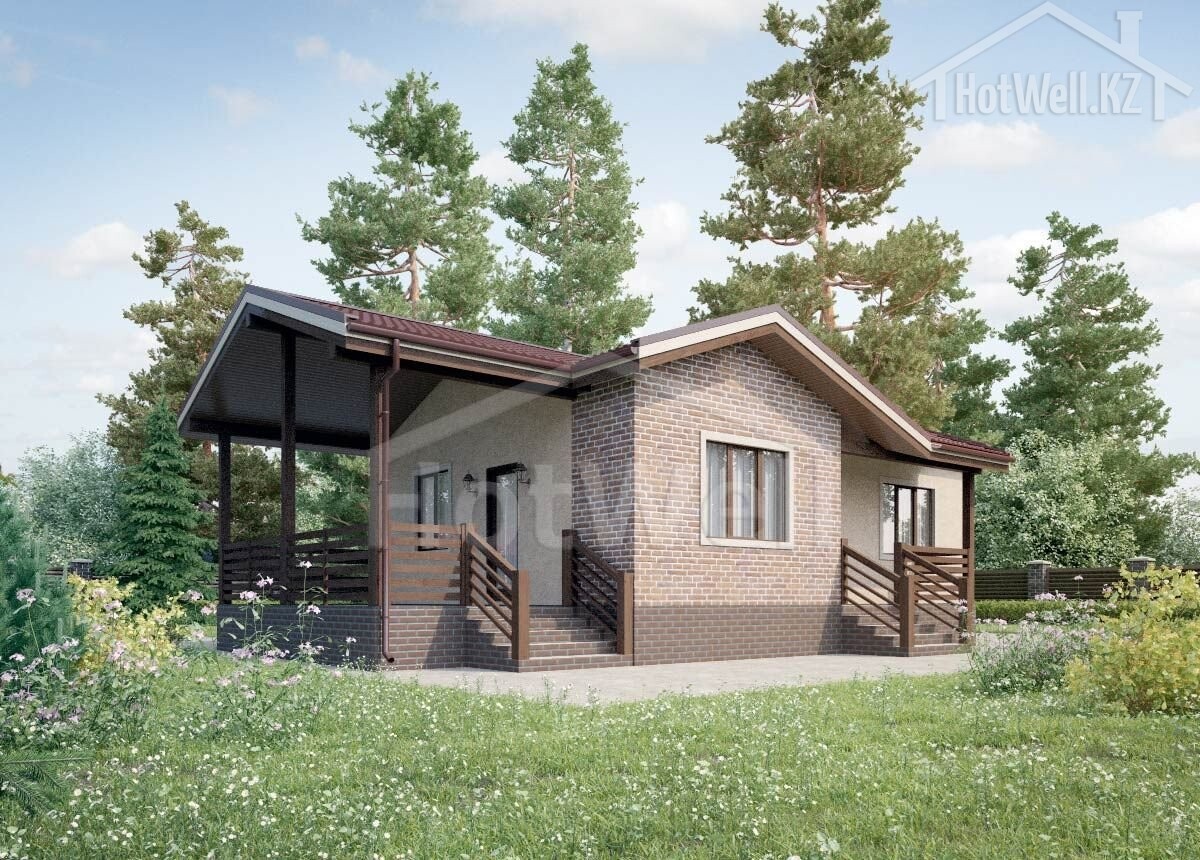 Одноэтажный дом 13 на 7 метров, общей площадью 88 м2, из СИП панелей, с террасой и спальней на первом этаже.