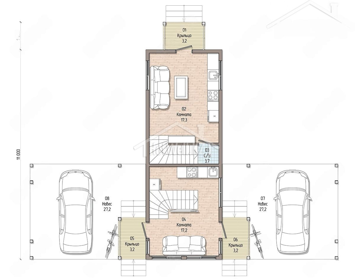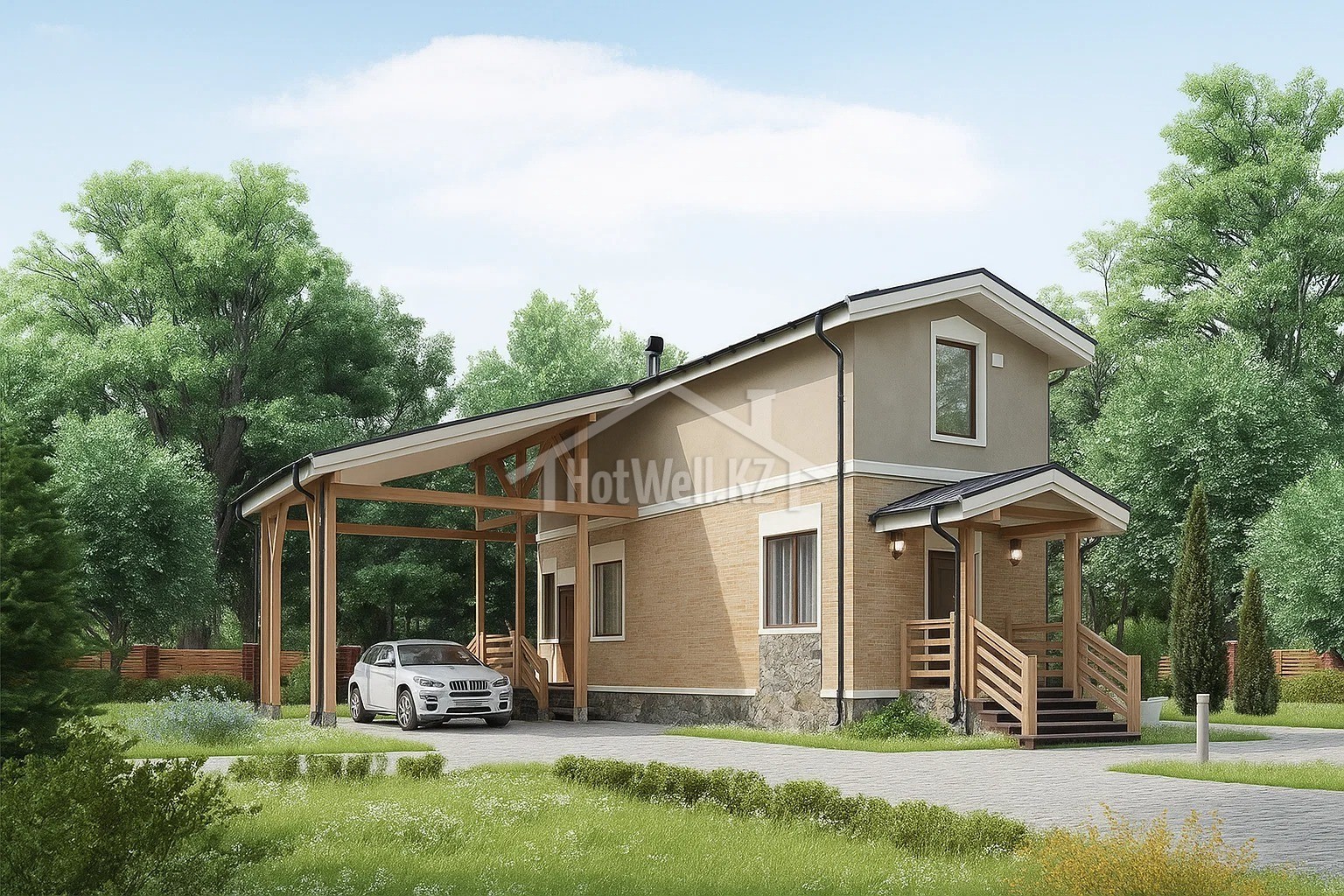 Двухэтажный дом 16 на 13 метров, общей площадью 151 м2, из СИП панелей, с навесом.