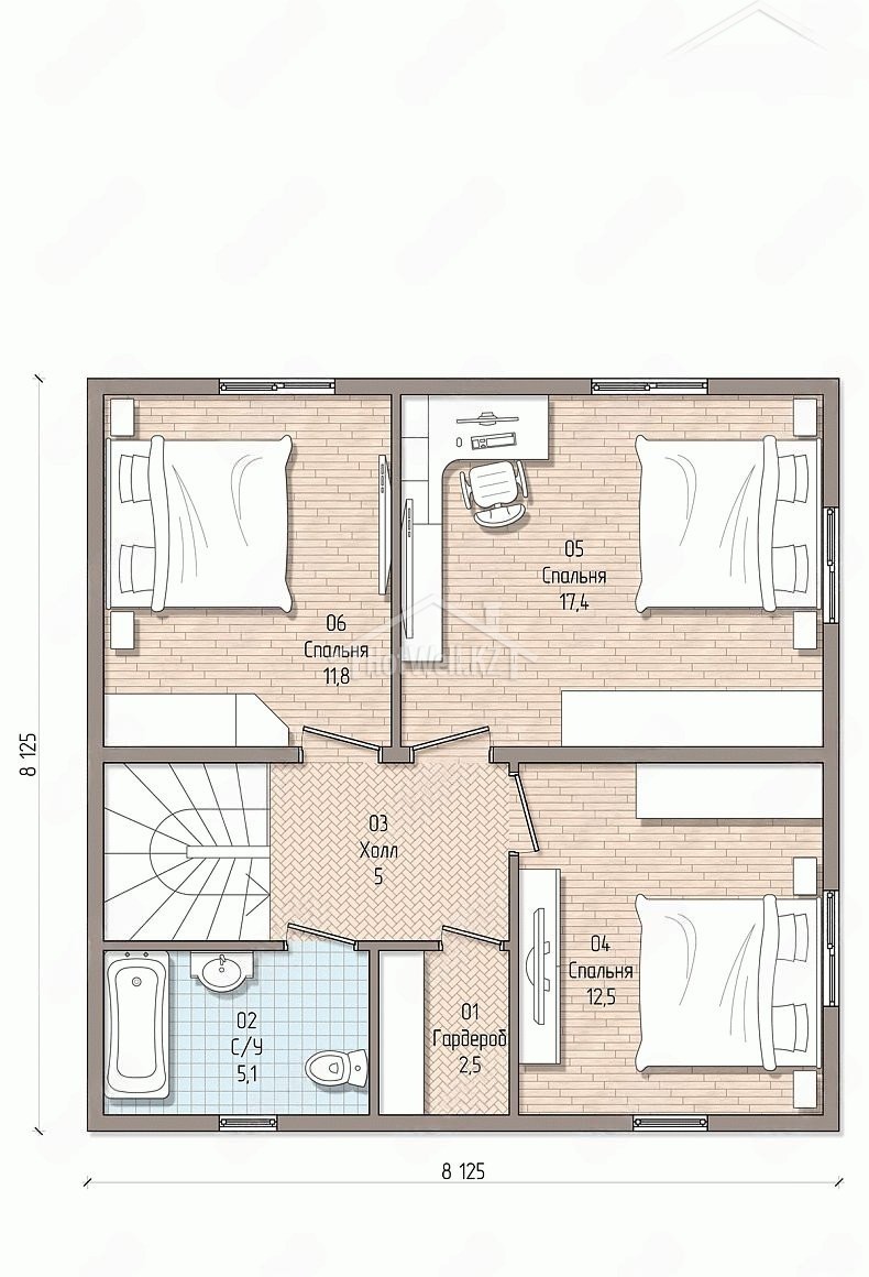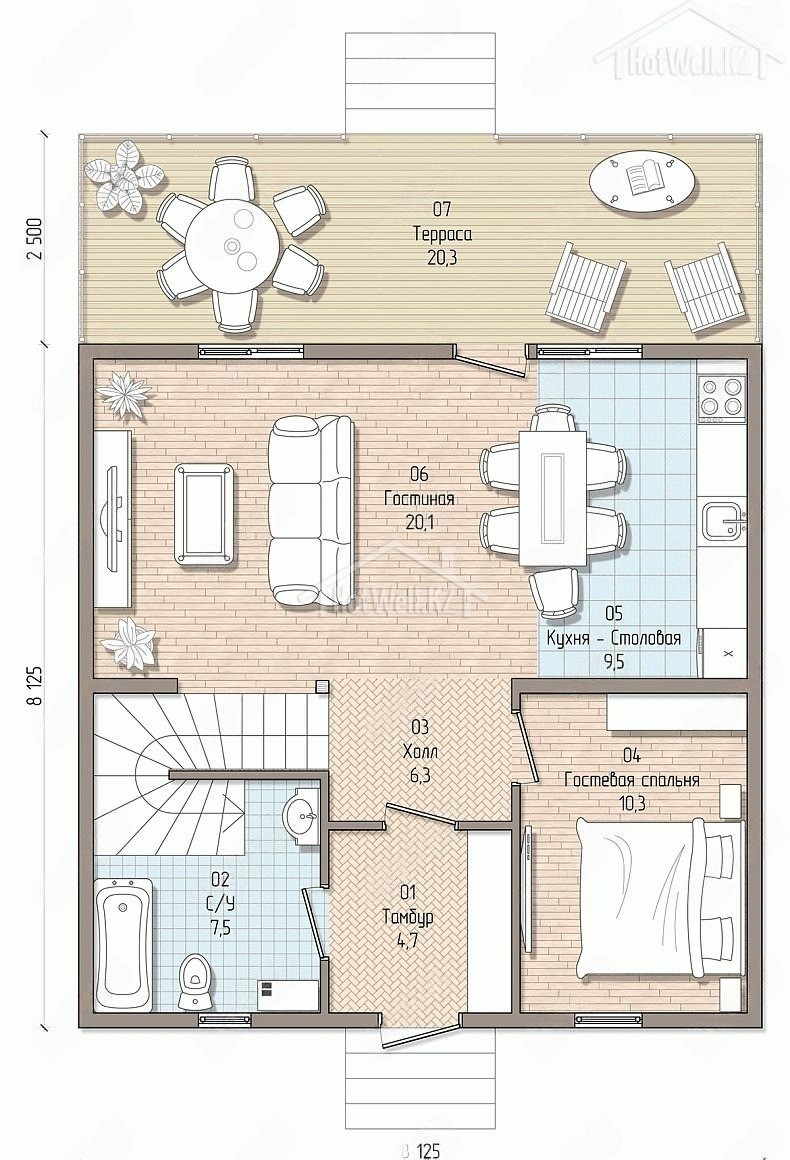 Двухэтажный дом 11 на 8 метров, общей площадью 152 м2, из СИП панелей, с террасой и спальней на первом этаже.