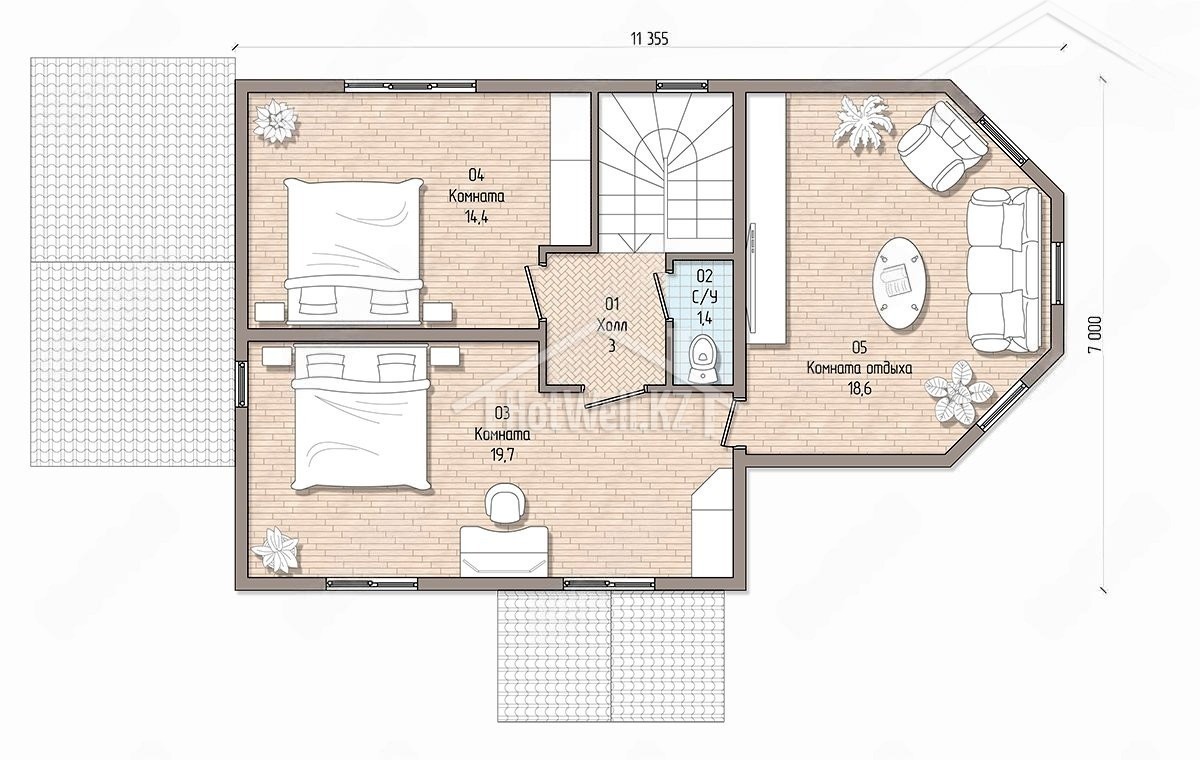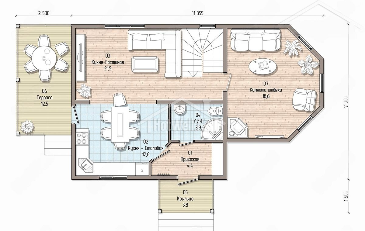Двухэтажный дом 14 на 9 метров, общей площадью 155 м2, из СИП панелей, с террасой, эркером и спальней на первом этаже.