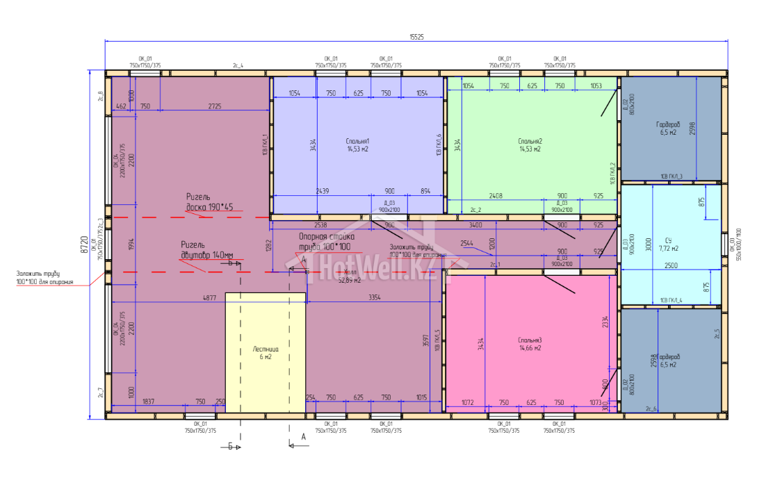 Высота стен 2,6 метра обеспечивает комфортную высоту потолков и помогает эффективно сохранять тепло внутри дома. Благодаря этому помещения остаются уютными и удобными для ежедневного проживания.