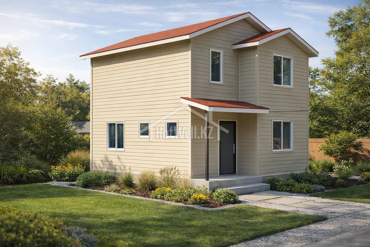 Дом имеет два этажа, что позволяет разделить пространство на общие и личные зоны. На первом этаже обычно располагаются кухня, гостиная и другие основные помещения, а на втором — спальни и комнаты для членов семьи.