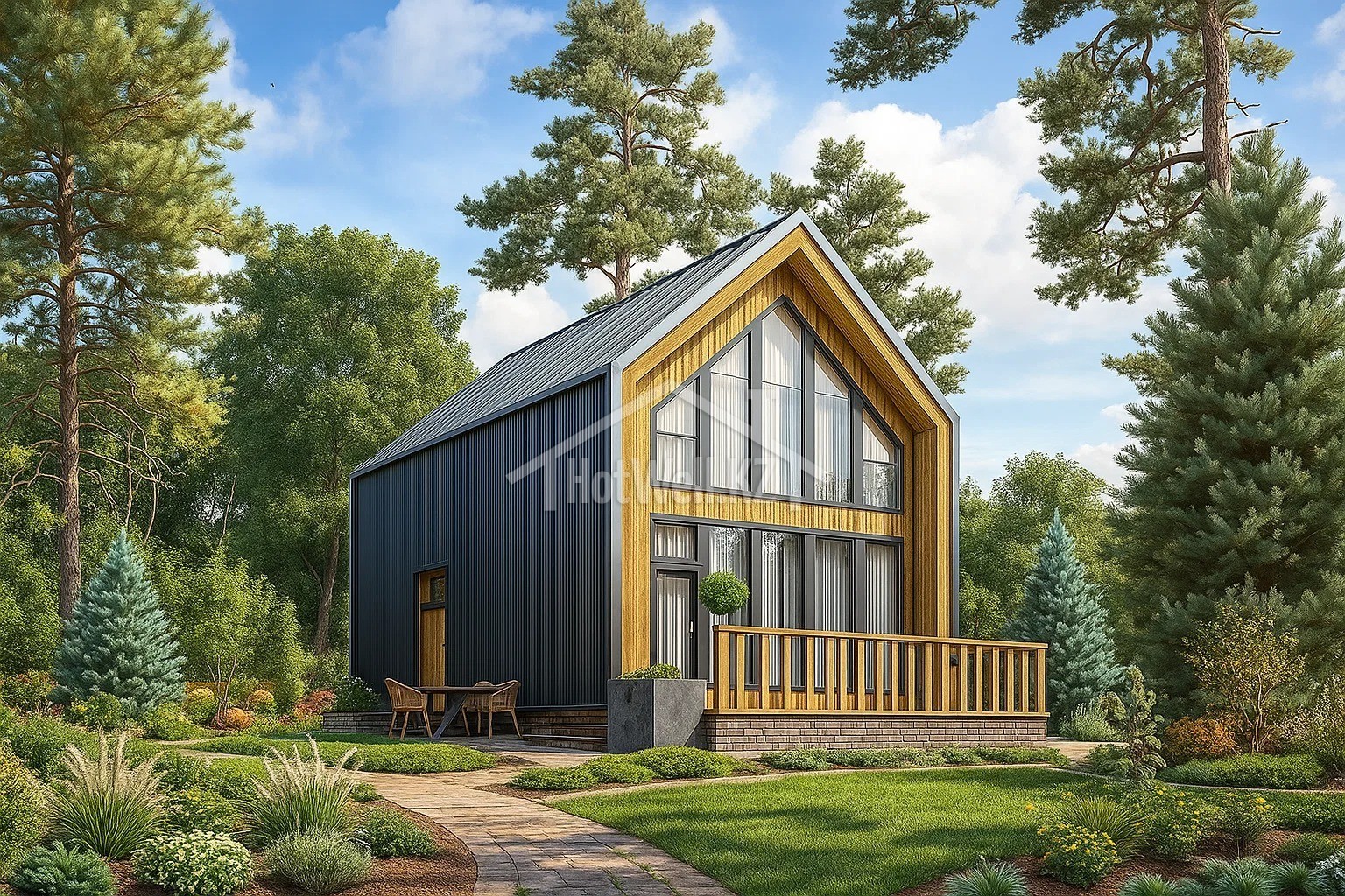 Дом с мансардой 10 на 8 метров, общей площадью 114 м2, из СИП панелей, с террасой и спальней на первом этаже.
