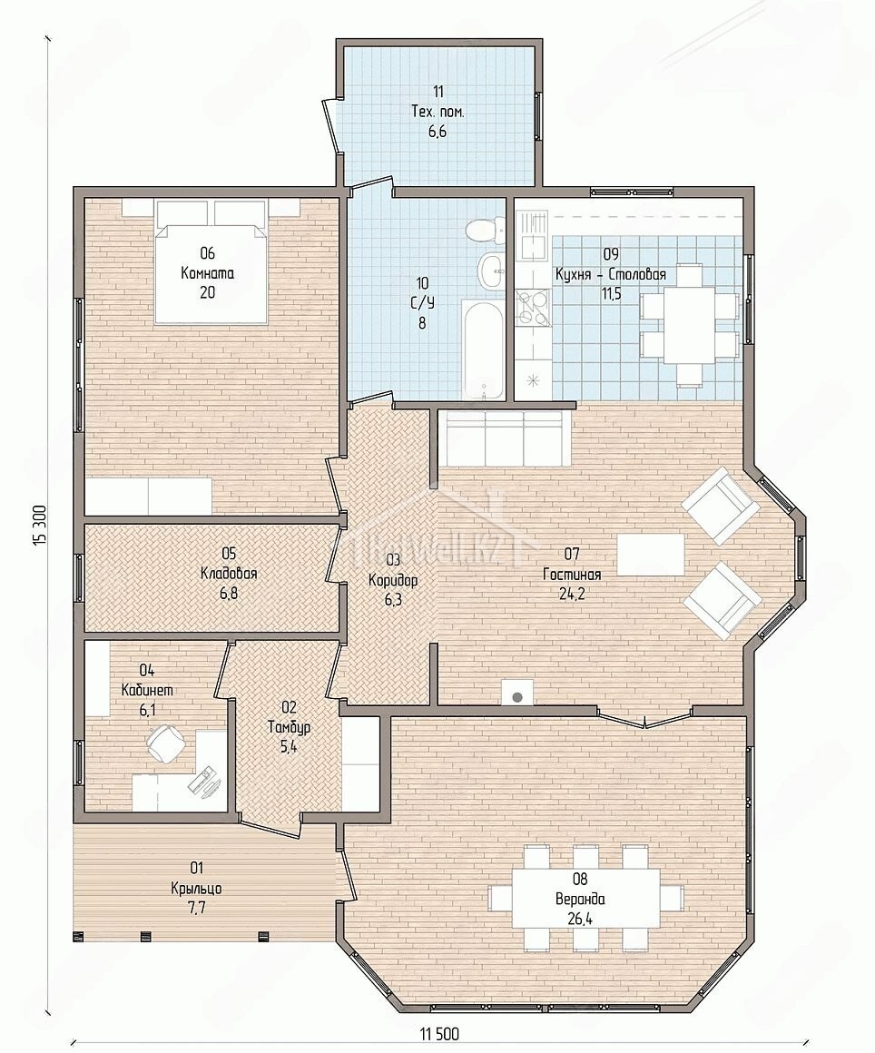 Одноэтажный дом 15 на 12 метров, общей площадью 142 м2, из СИП панелей, с бойлерной, террасой, эркером и спальней на первом этаже.