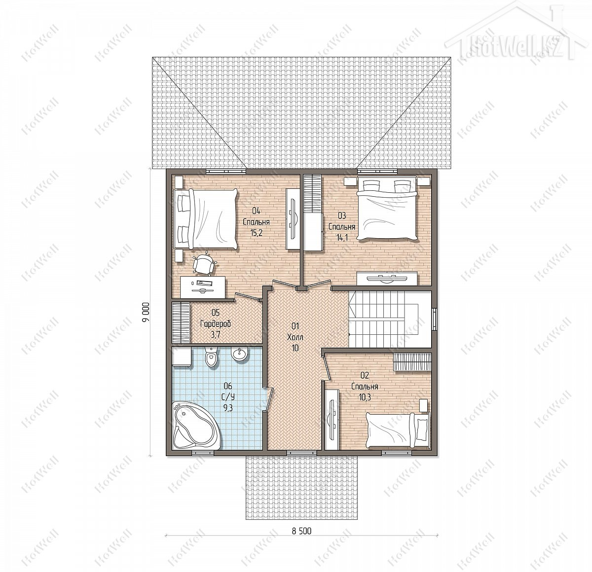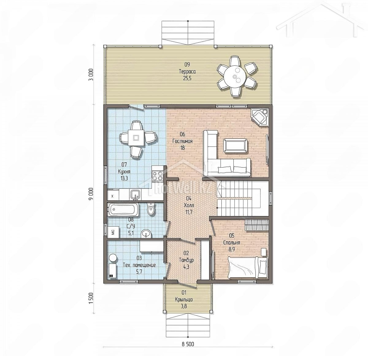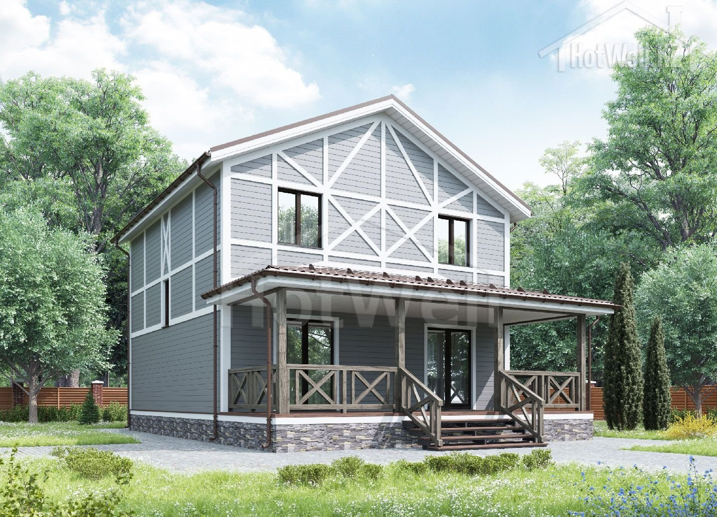 Двухэтажный дом 14 на 9 метров, общей площадью 182 м2, из СИП панелей, с бойлерной, террасой и спальней на первом этаже.