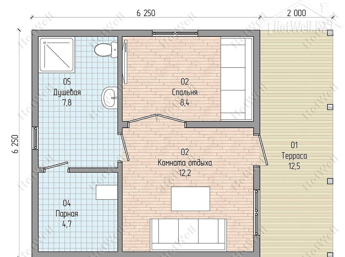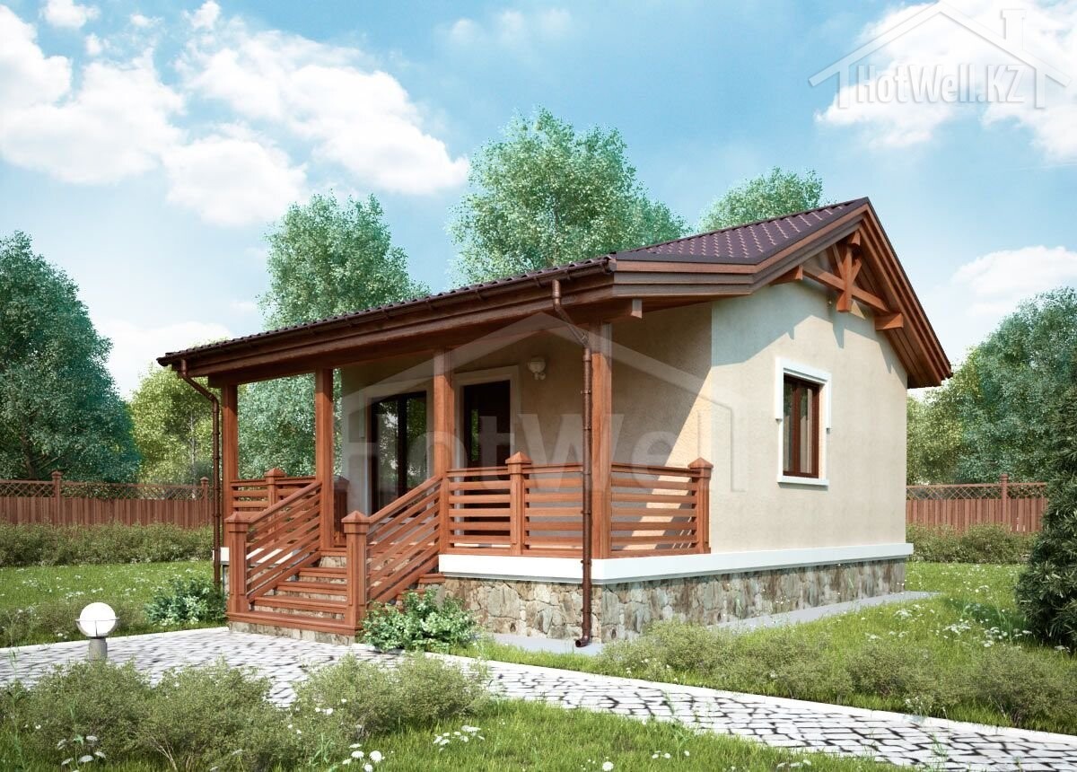 Одноэтажный дом 8 на 6 метров, общей площадью 52 м2, из СИП панелей, с сауной, террасой и спальней на первом этаже.
