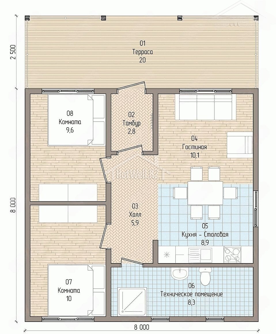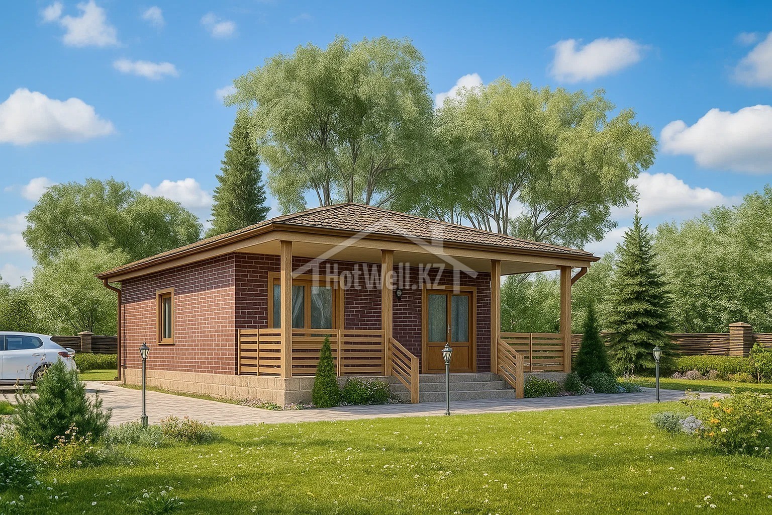 Одноэтажный дом 11 на 8 метров, общей площадью 84 м2, из СИП панелей, с бойлерной, террасой и спальней на первом этаже.