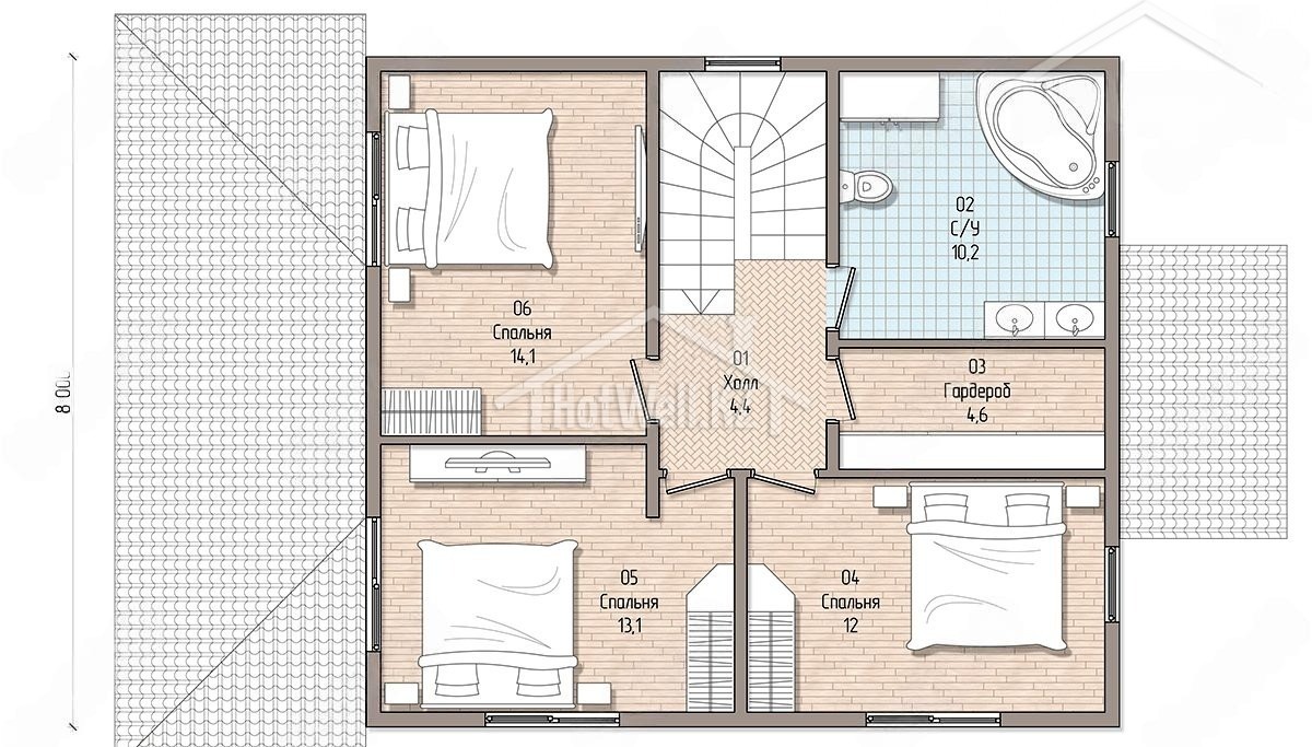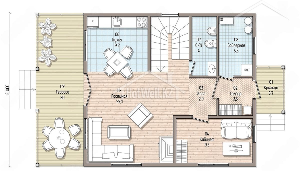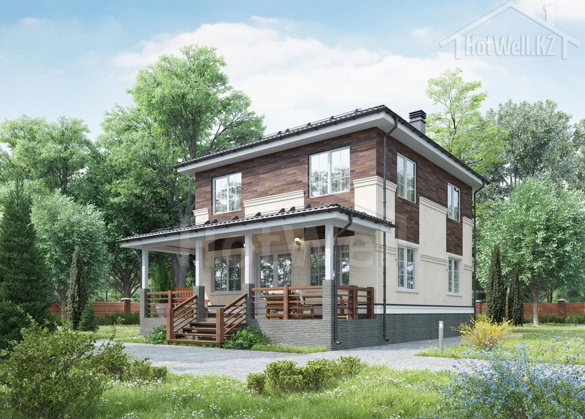 Двухэтажный дом 13 на 8 метров, общей площадью 168 м2, из СИП панелей, с бойлерной, террасой и спальней на первом этаже.