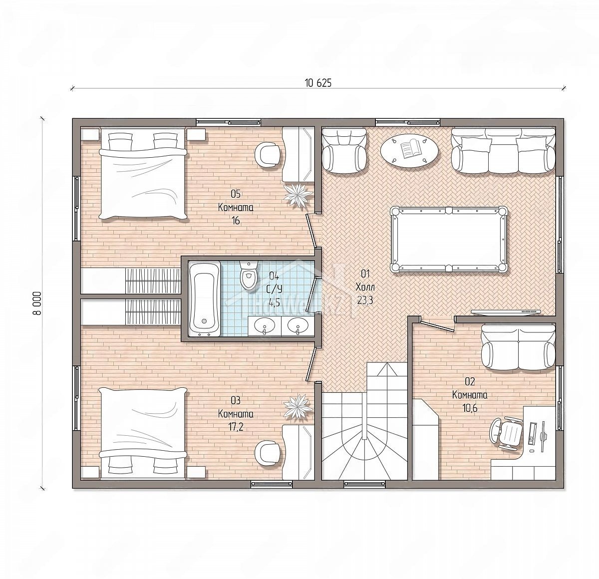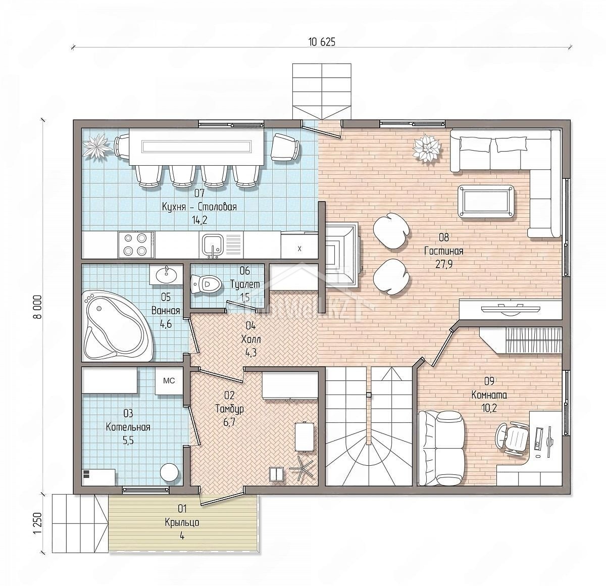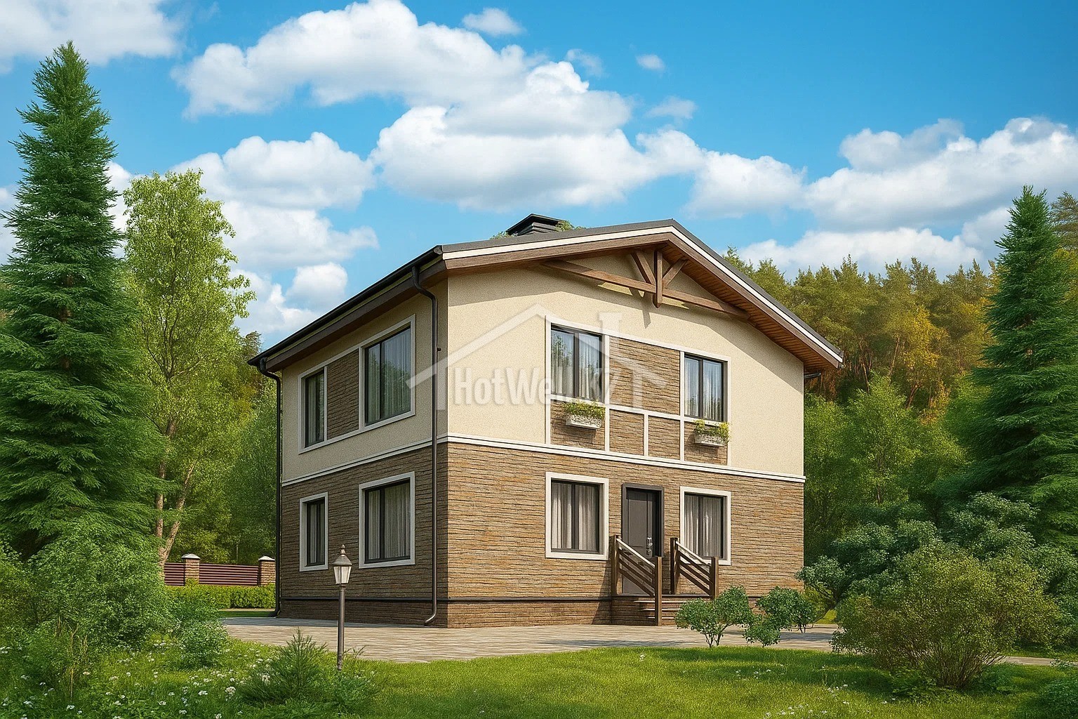 Двухэтажный дом 11 на 9 метров, общей площадью 174 м2, из СИП панелей, с бойлерной и спальней на первом этаже.