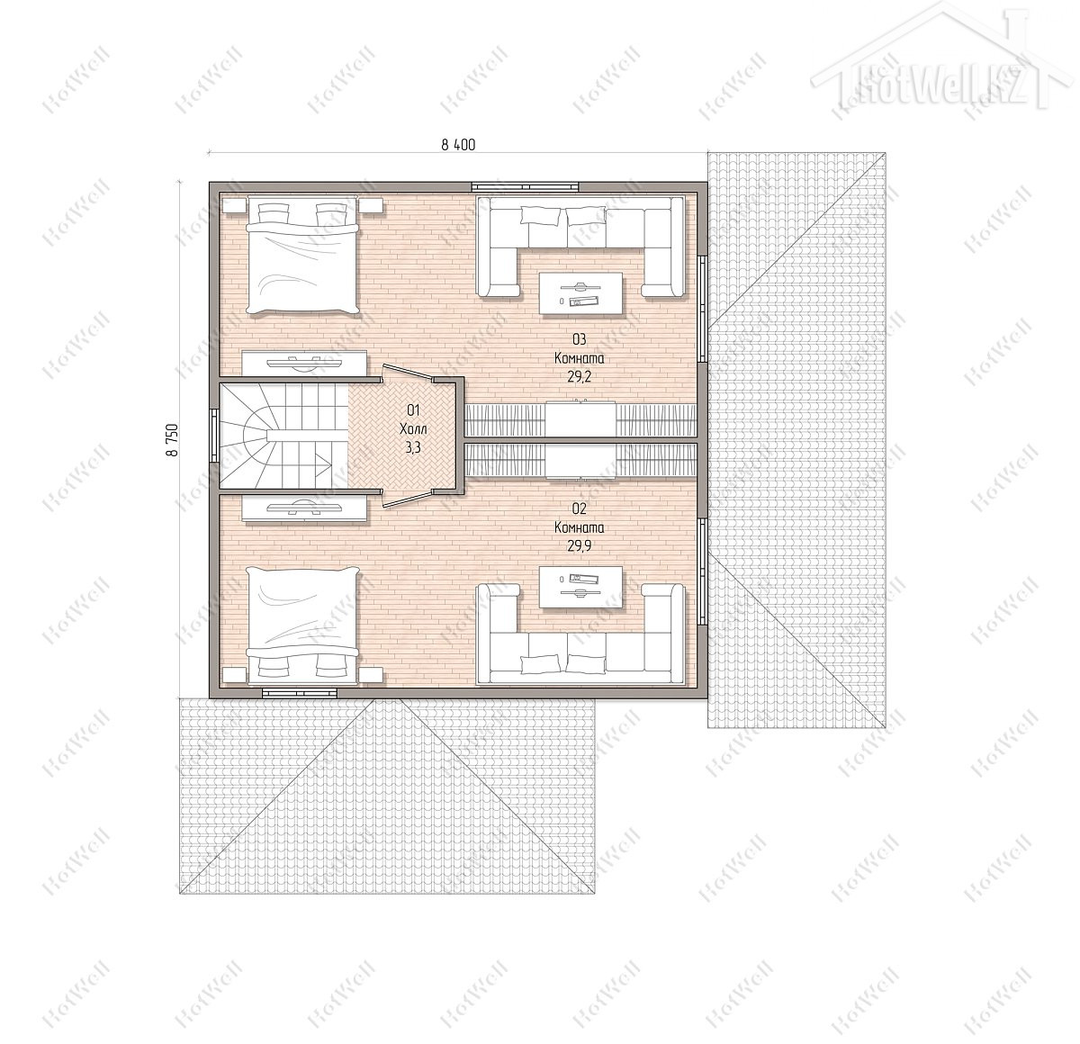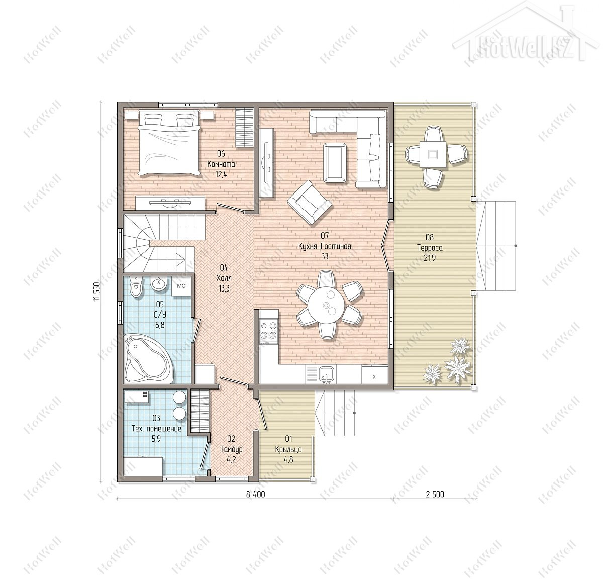 Двухэтажный дом 12 на 11 метров, общей площадью 185 м2, из СИП панелей, с бойлерной, террасой и спальней на первом этаже.