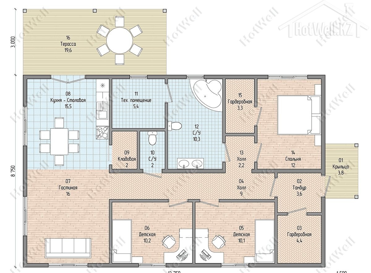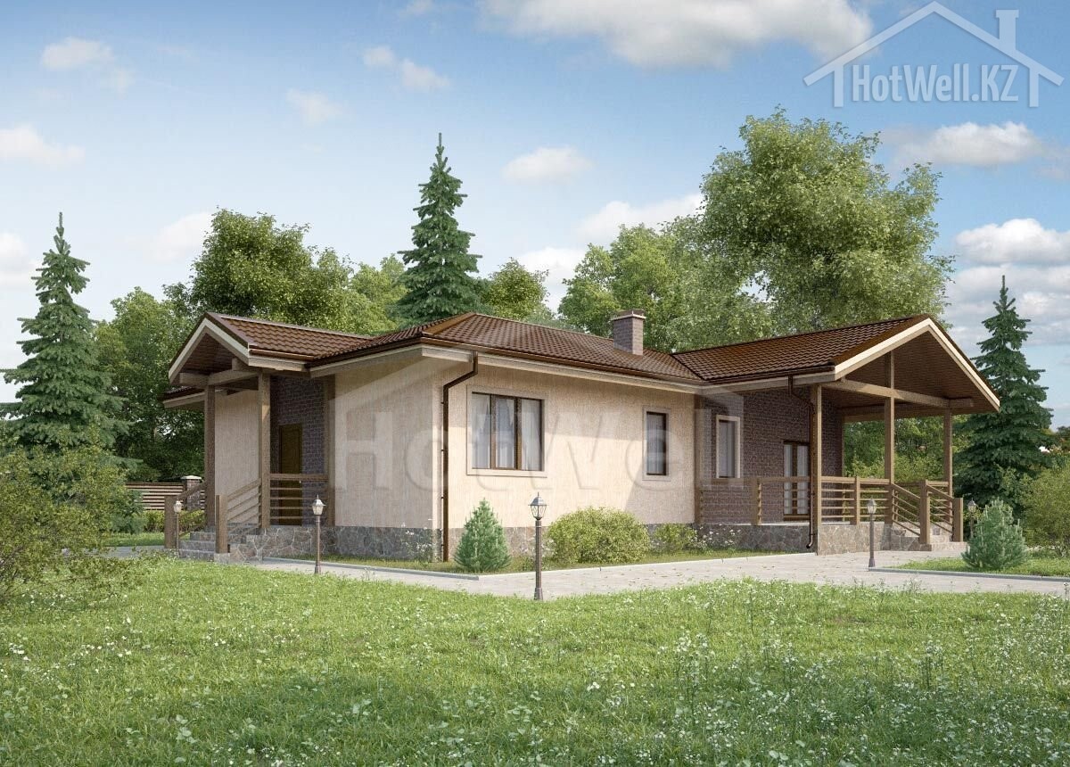 Одноэтажный дом 15 на 12 метров, общей площадью 144 м2, из СИП панелей, с бойлерной, террасой и спальней на первом этаже.