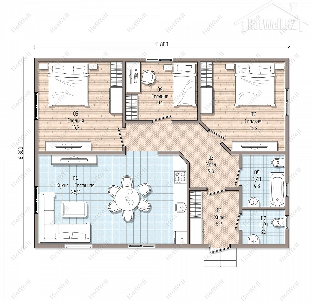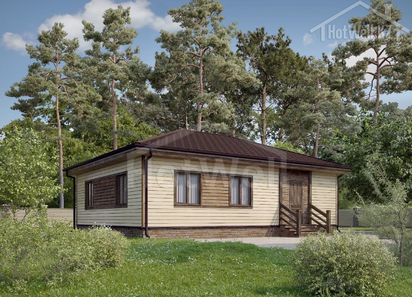 Одноэтажный дом 12 на 9 метров, общей площадью 104 м2, из СИП панелей, со спальней на первом этаже.