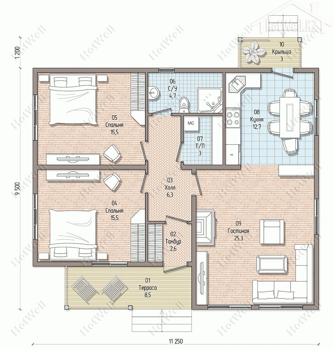 Одноэтажный дом 11 на 11 метров, общей площадью 107 м2, из СИП панелей, с бойлерной и спальней на первом этаже.