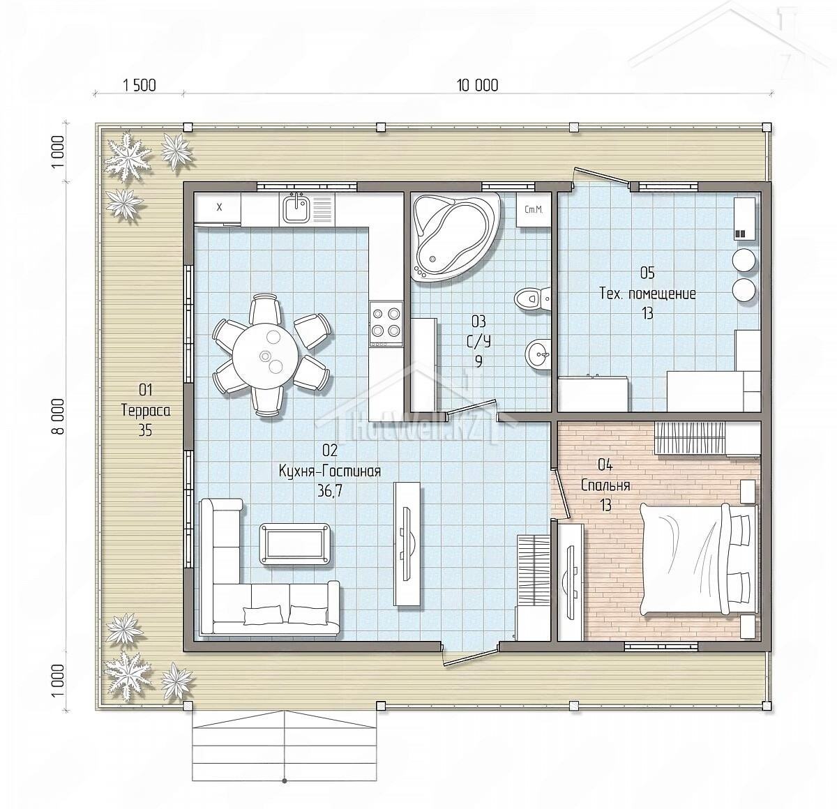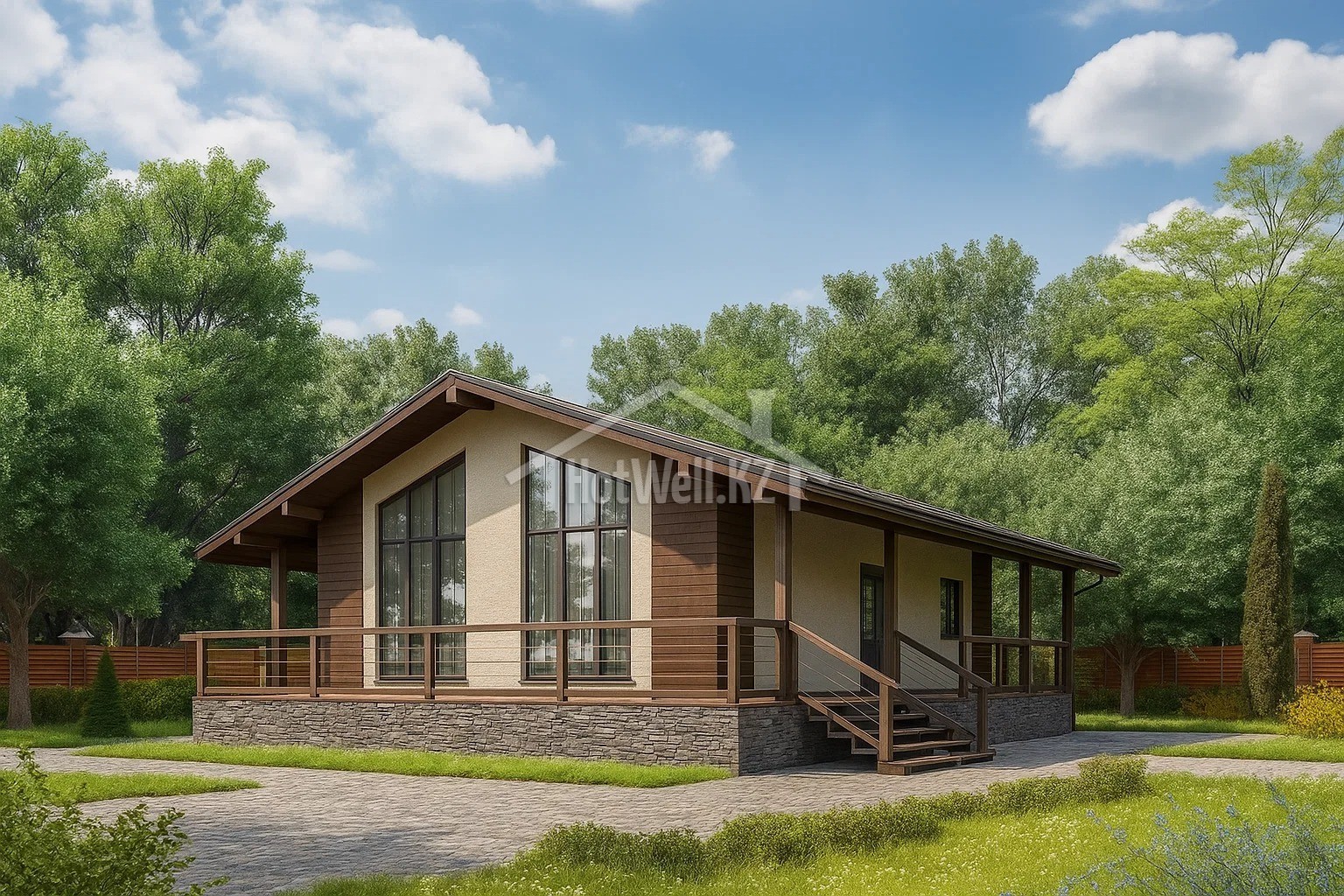 Одноэтажный дом 12 на 10 метров, общей площадью 115 м2, из СИП панелей, с бойлерной и спальней на первом этаже.