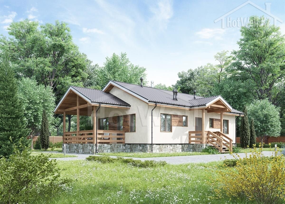Одноэтажный дом 15 на 10 метров, общей площадью 118 м2, из СИП панелей, с бойлерной, террасой и спальней на первом этаже.