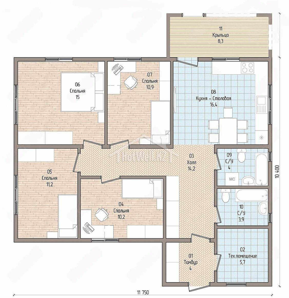Одноэтажный дом 12 на 12 метров, общей площадью 118 м2, из СИП панелей, с бойлерной и спальней на первом этаже.