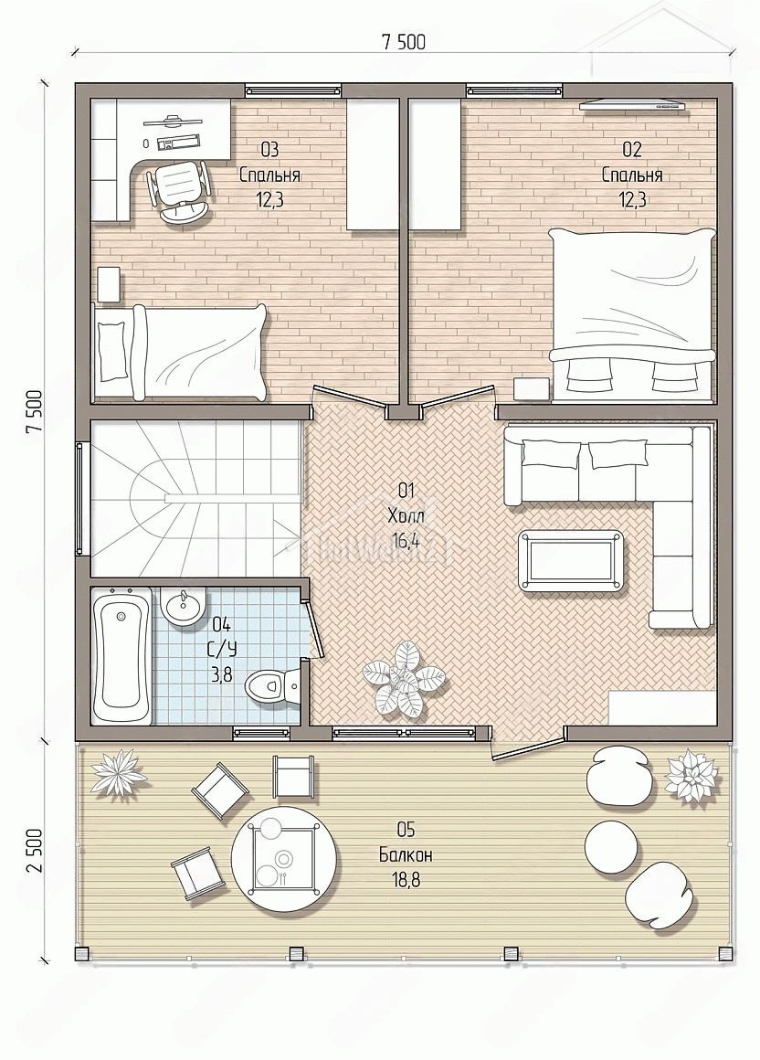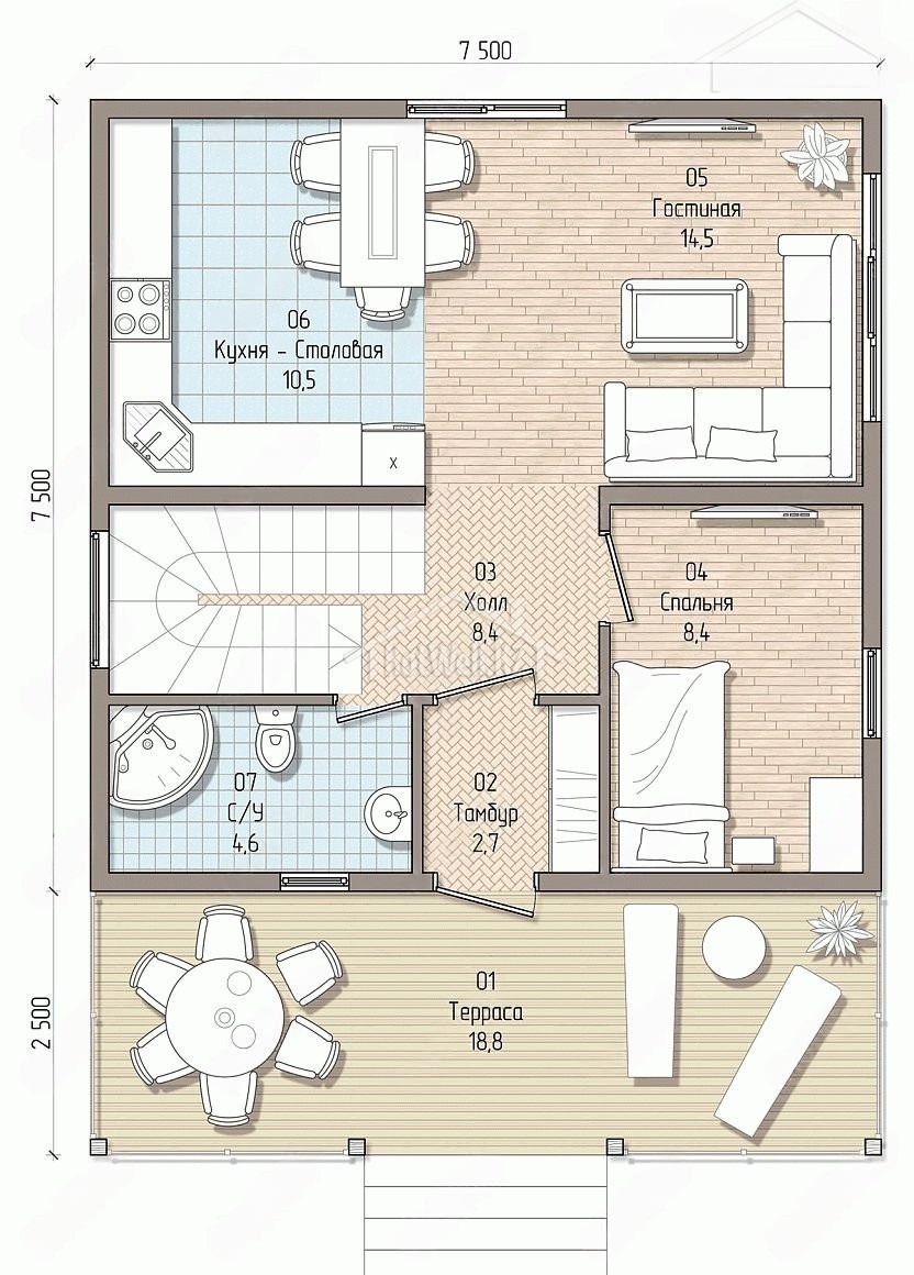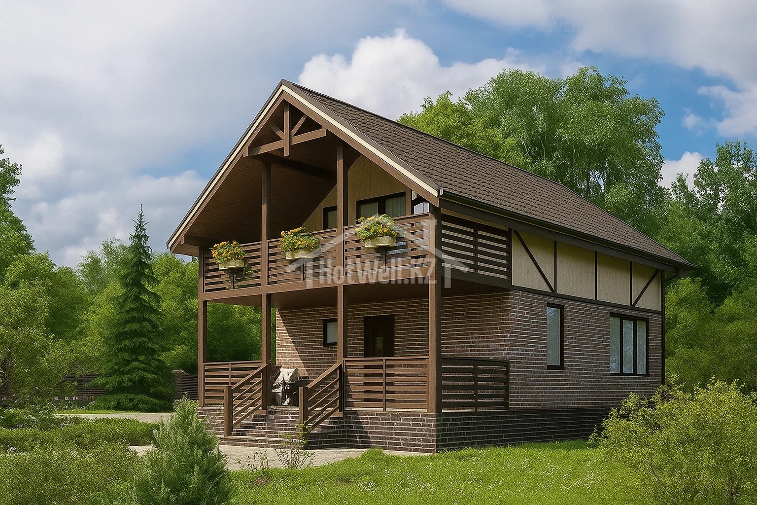Дом с мансардой 10 на 8 метров, общей площадью 150 м2, из СИП панелей, с террасой, балконом и спальней на первом этаже.