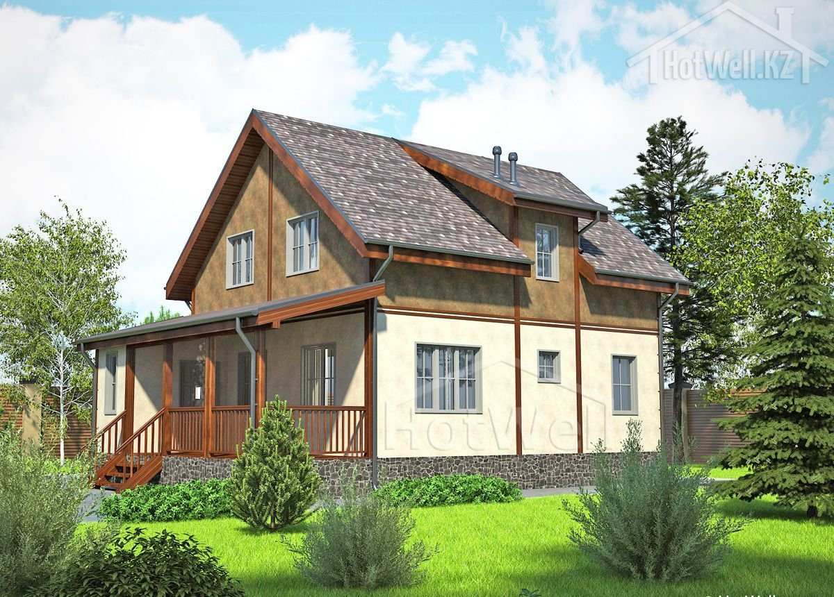 Дом с мансардой 9 на 8 метров, общей площадью 154 м2, из СИП панелей, с террасой и спальней на первом этаже.