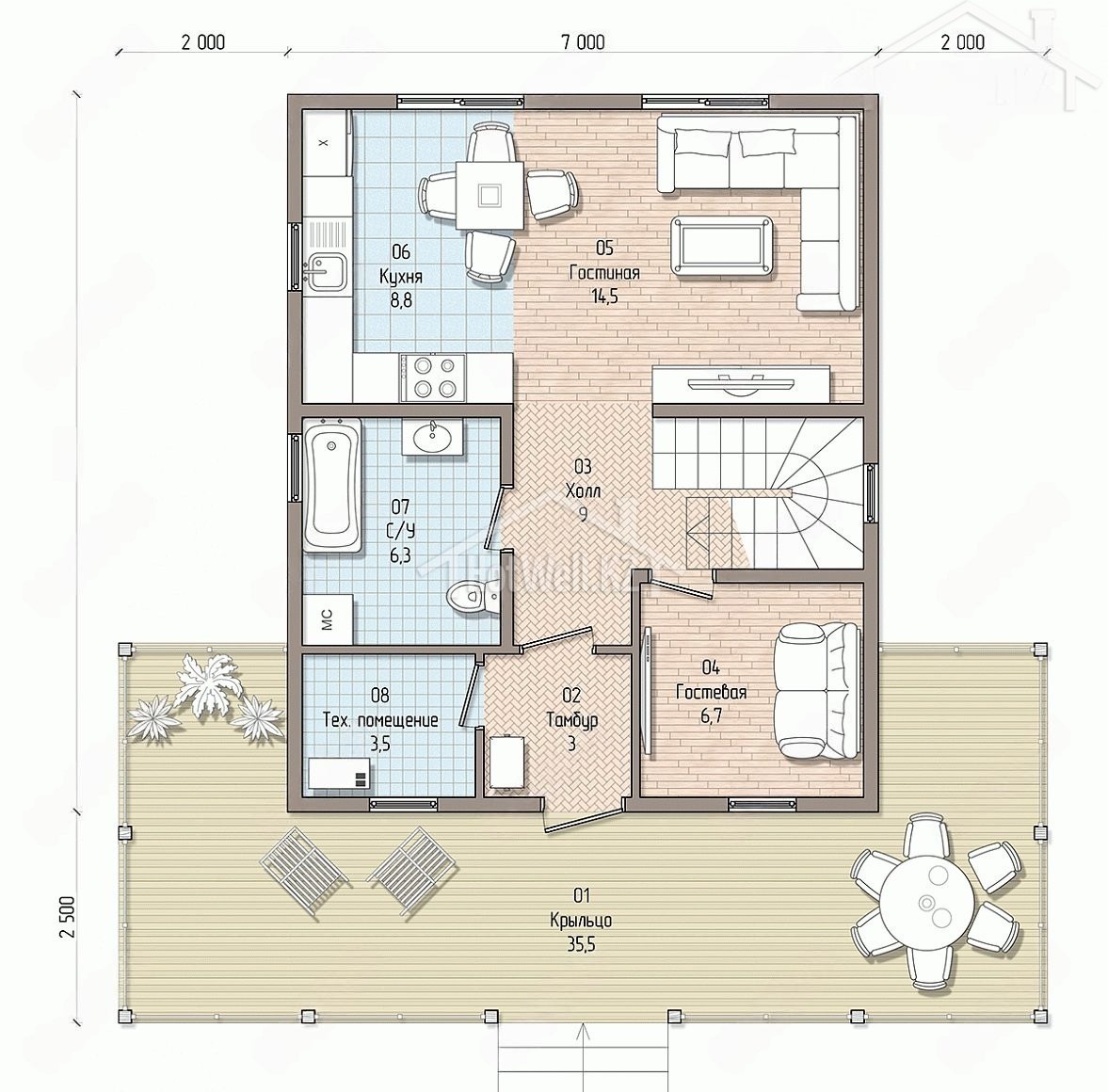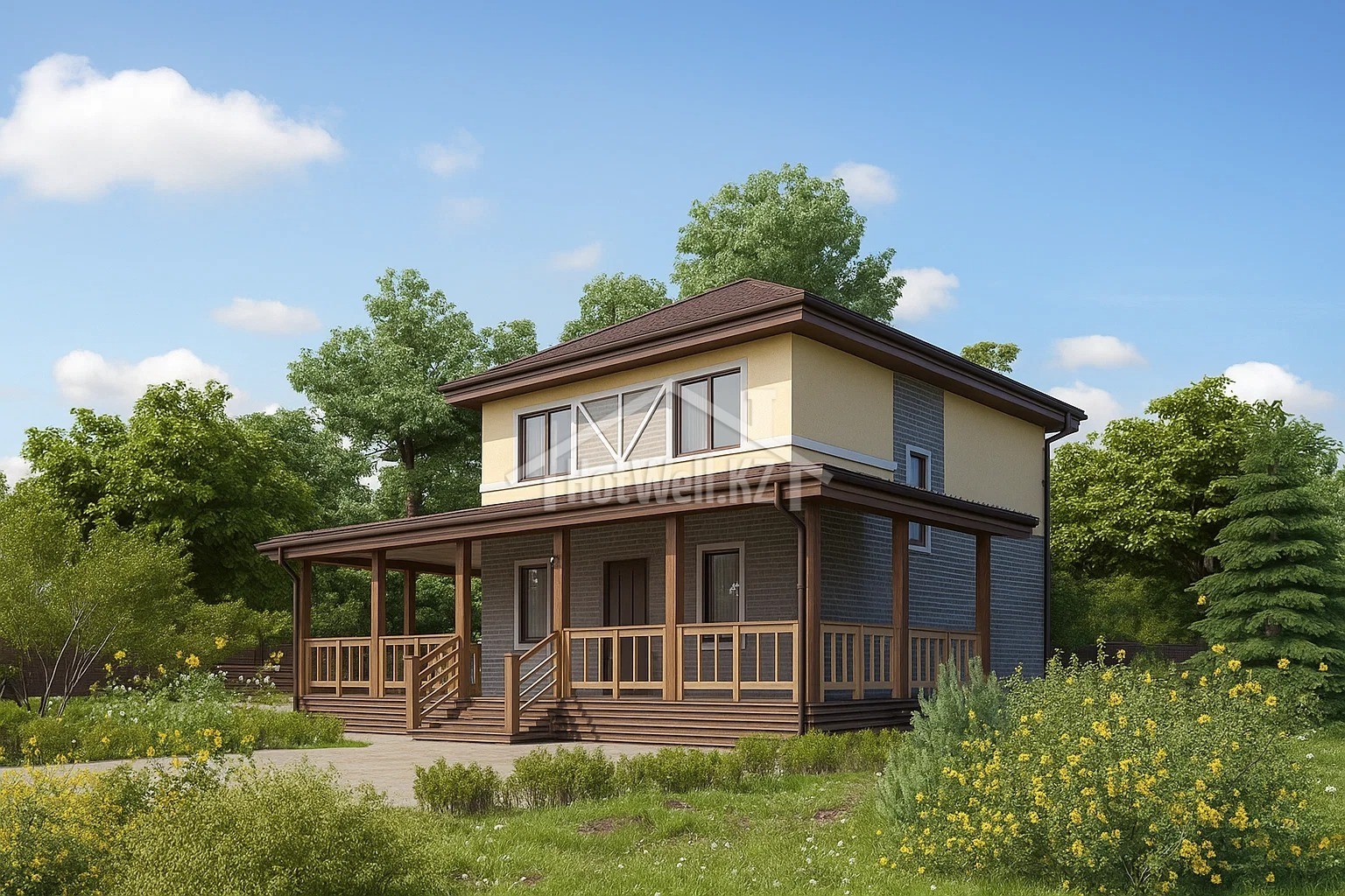 Двухэтажный дом 11 на 11 метров, общей площадью 154 м2, из СИП панелей, со спальней на первом этаже.