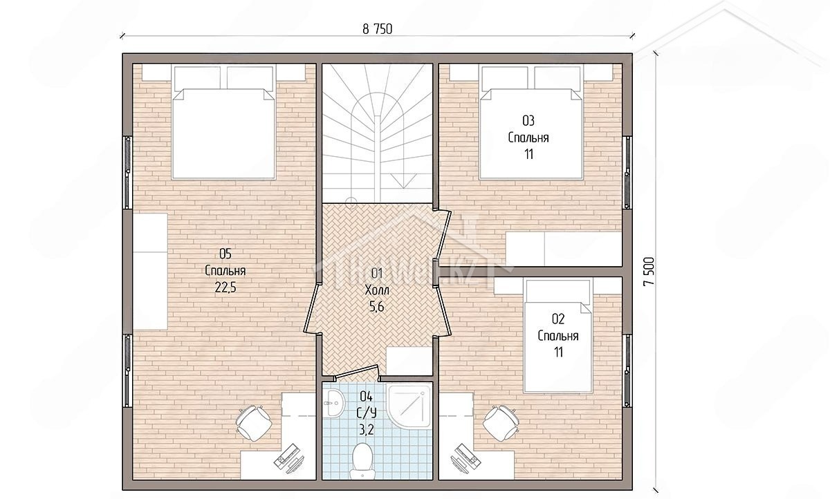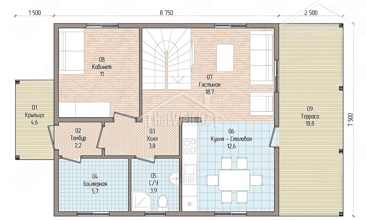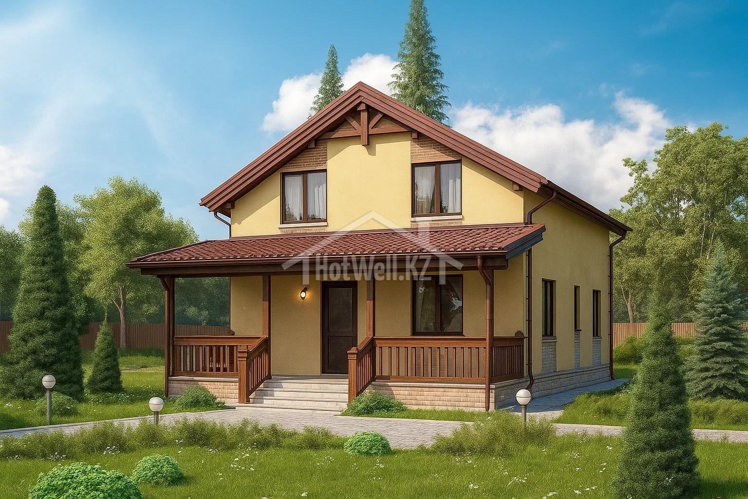 Дом с мансардой 13 на 8 метров, общей площадью 155 м2, из СИП панелей, с бойлерной, террасой и спальней на первом этаже.