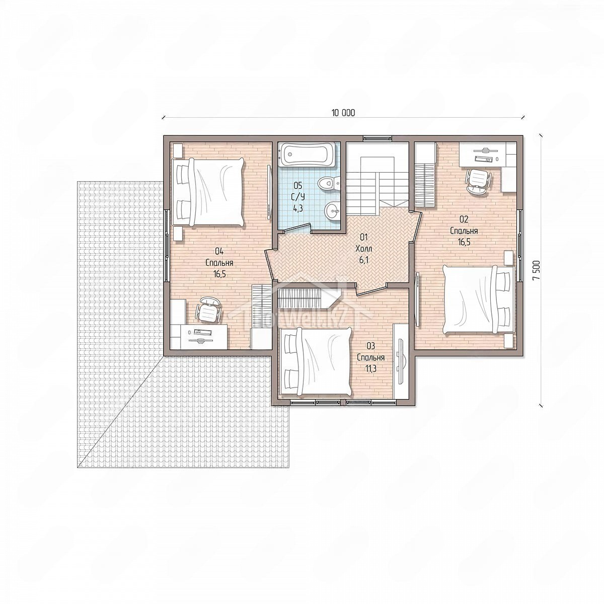 Данный проект дома основан на основе популярного проекта А-100, разница в том что у данного проекта вынесено за пределы дома тех помещение с тамбуром. Проект имеет большую гостинную на первом этаже 22 м2, отдельную кухню. Второй этаж имеет три спальни и сан узел. Тип крыши двускатная. Очень хороший и популярный проект.