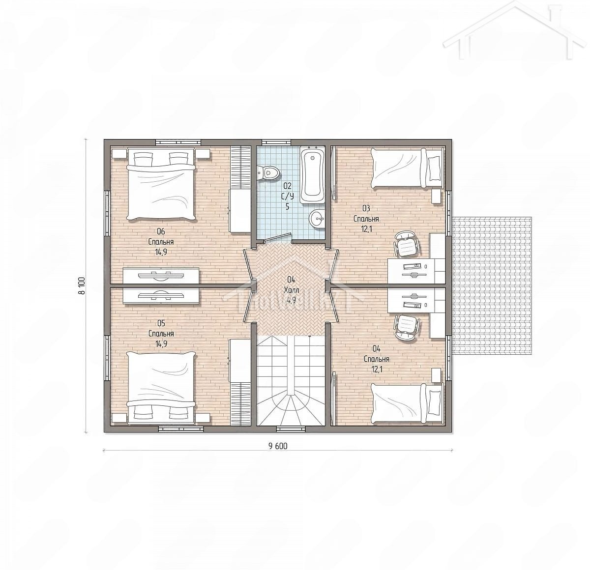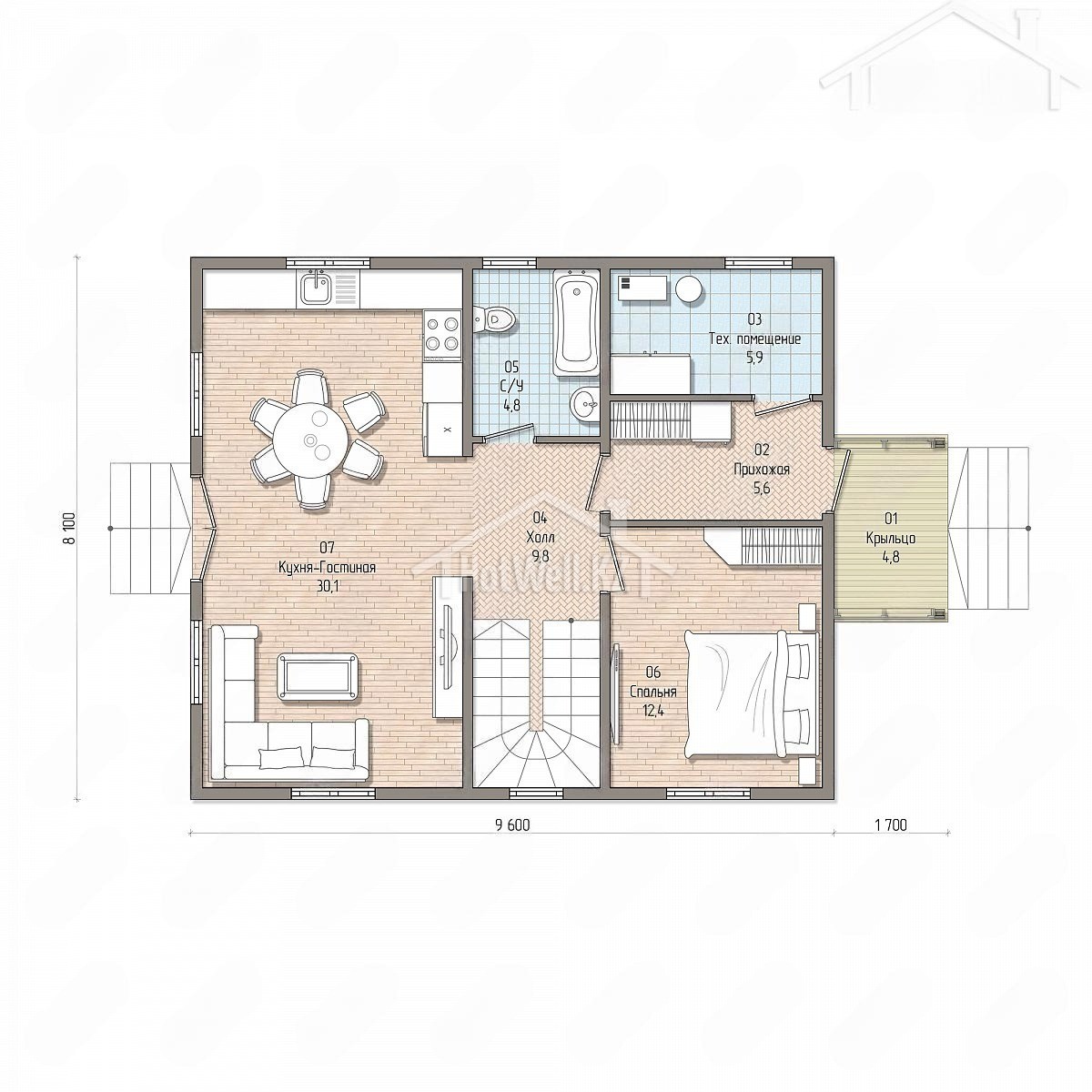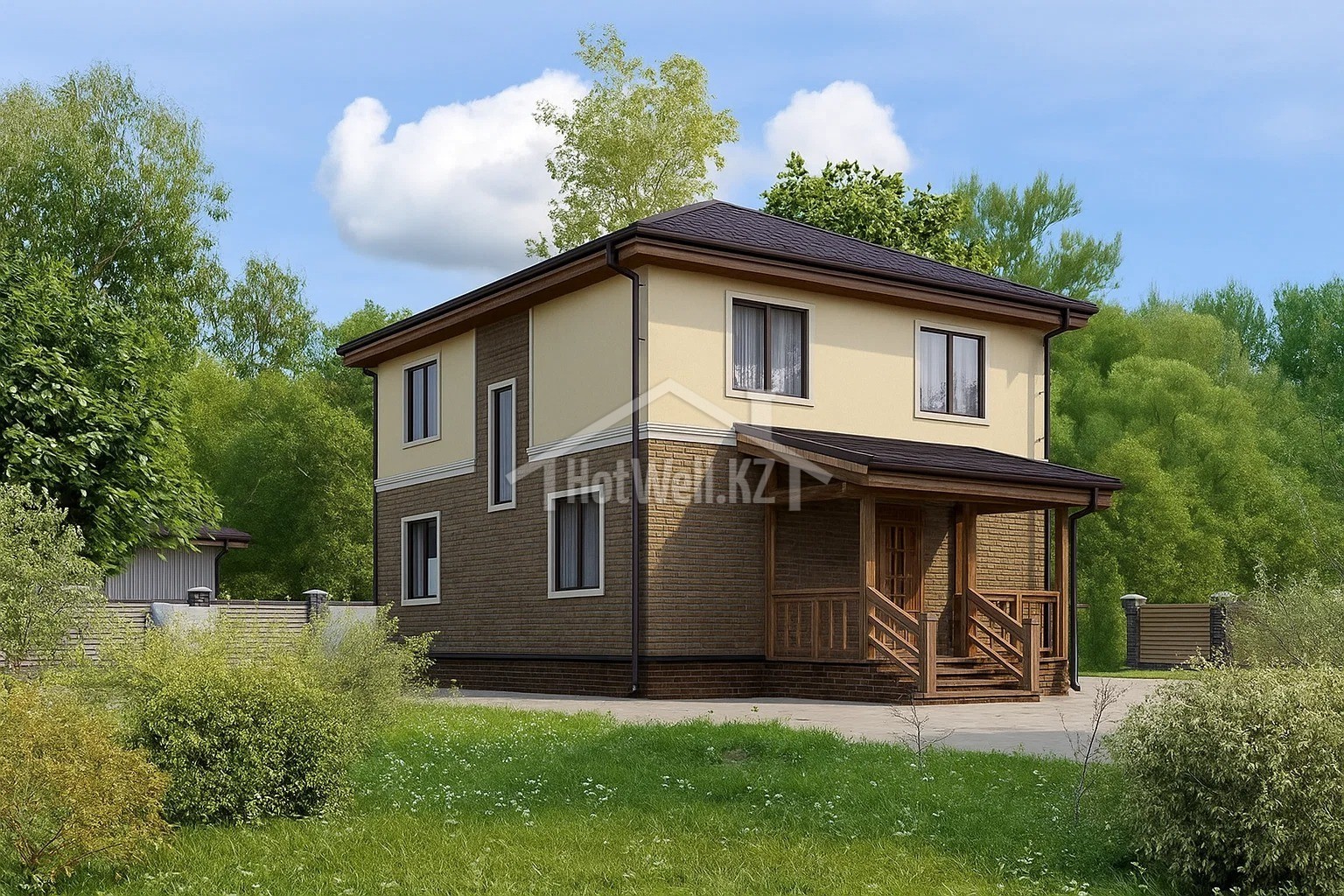 Двухэтажный дом 11 на 8 метров, общей площадью 156 м2, из СИП панелей, с бойлерной и спальней на первом этаже.