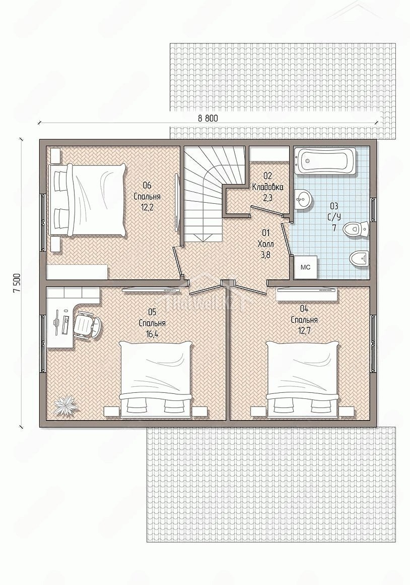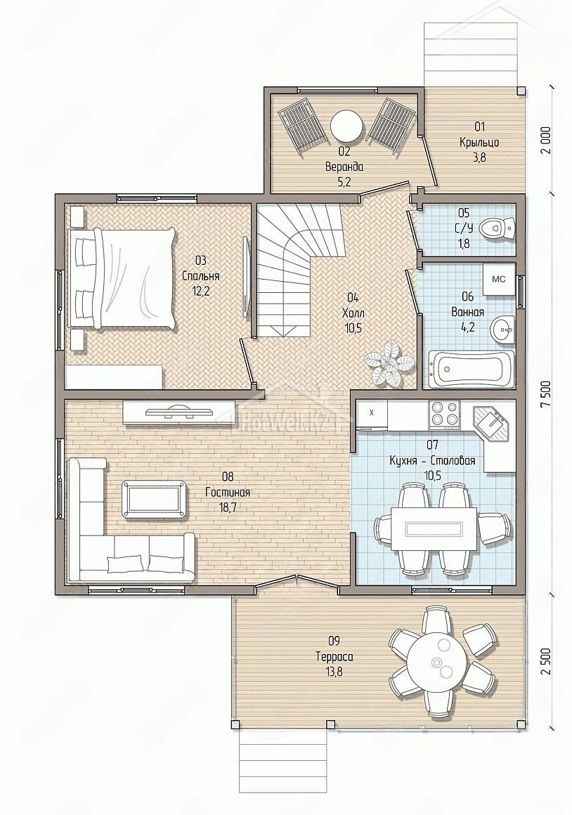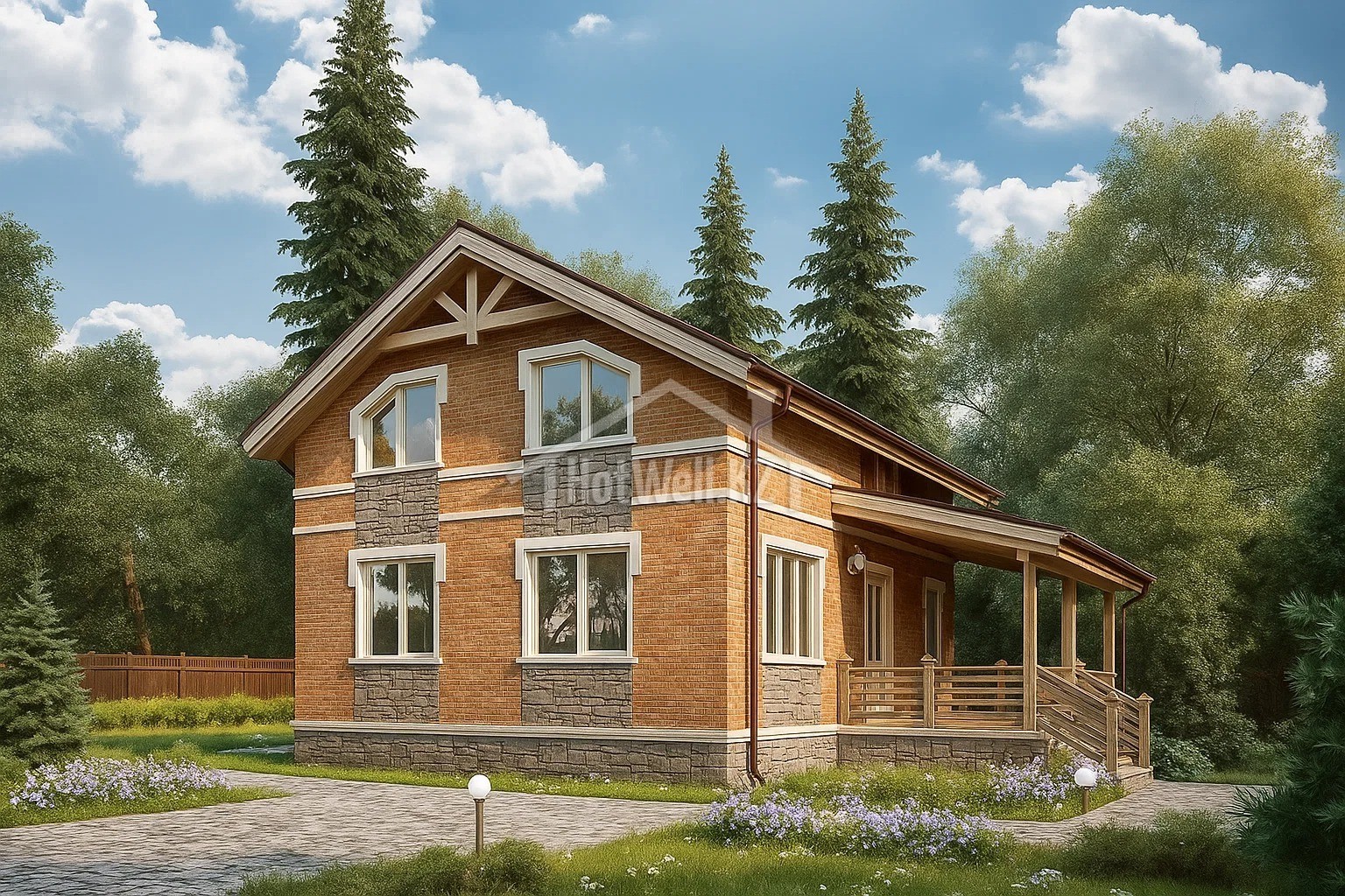Дом с мансардой 12 на 9 метров, общей площадью 156 м2, из СИП панелей, с террасой и спальней на первом этаже.