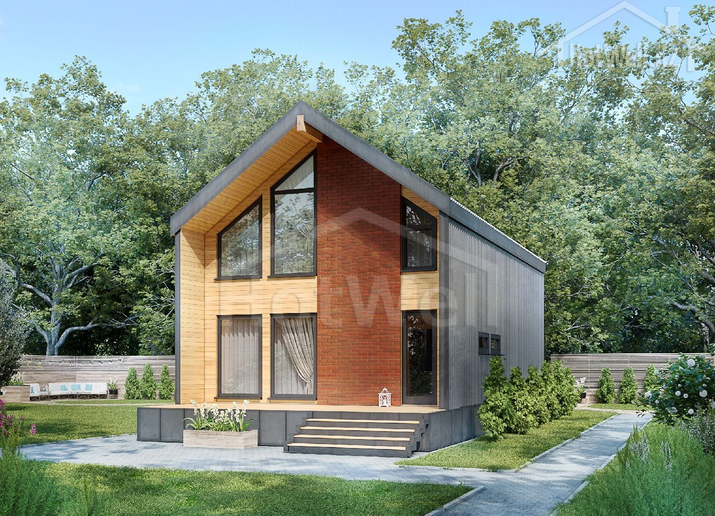 Дом с мансардой 14 на 7 метров, общей площадью 164 м2, из СИП панелей, с сауной и бойлерной.