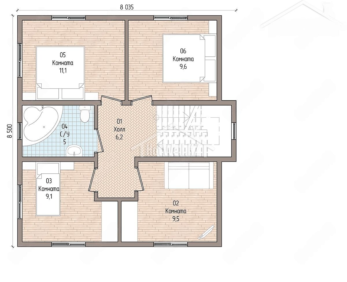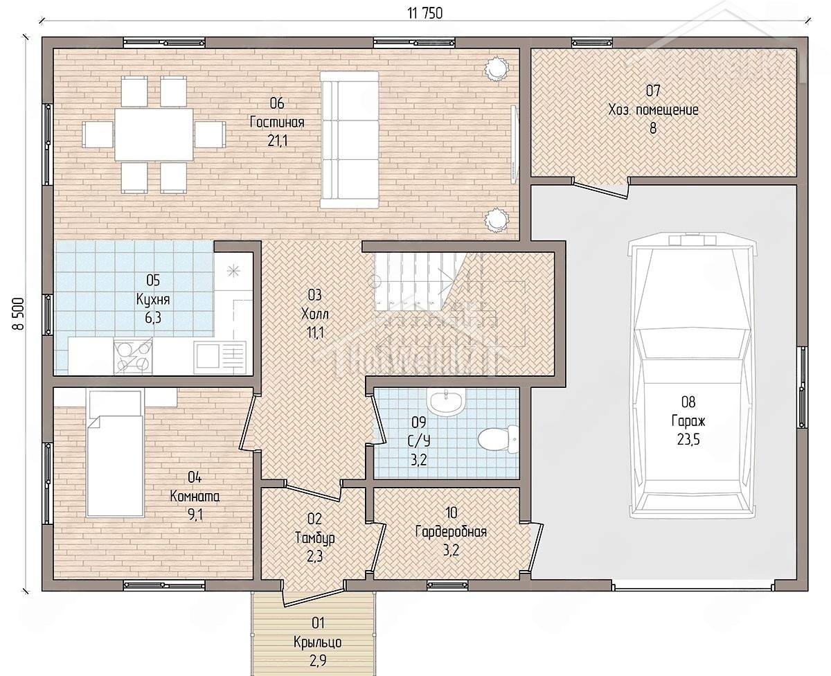 Двухэтажный дом 12 на 10 метров, общей площадью 168 м2, из СИП панелей, с гаражом и спальней на первом этаже.