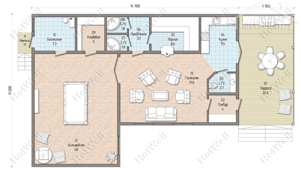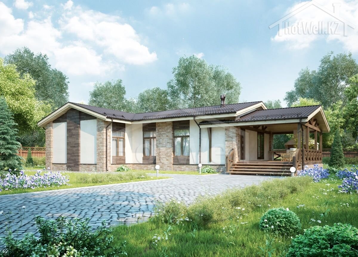 Одноэтажный дом 19 на 11 метров, общей площадью 171 м2, из СИП панелей, с сауной, бойлерной и террасой.