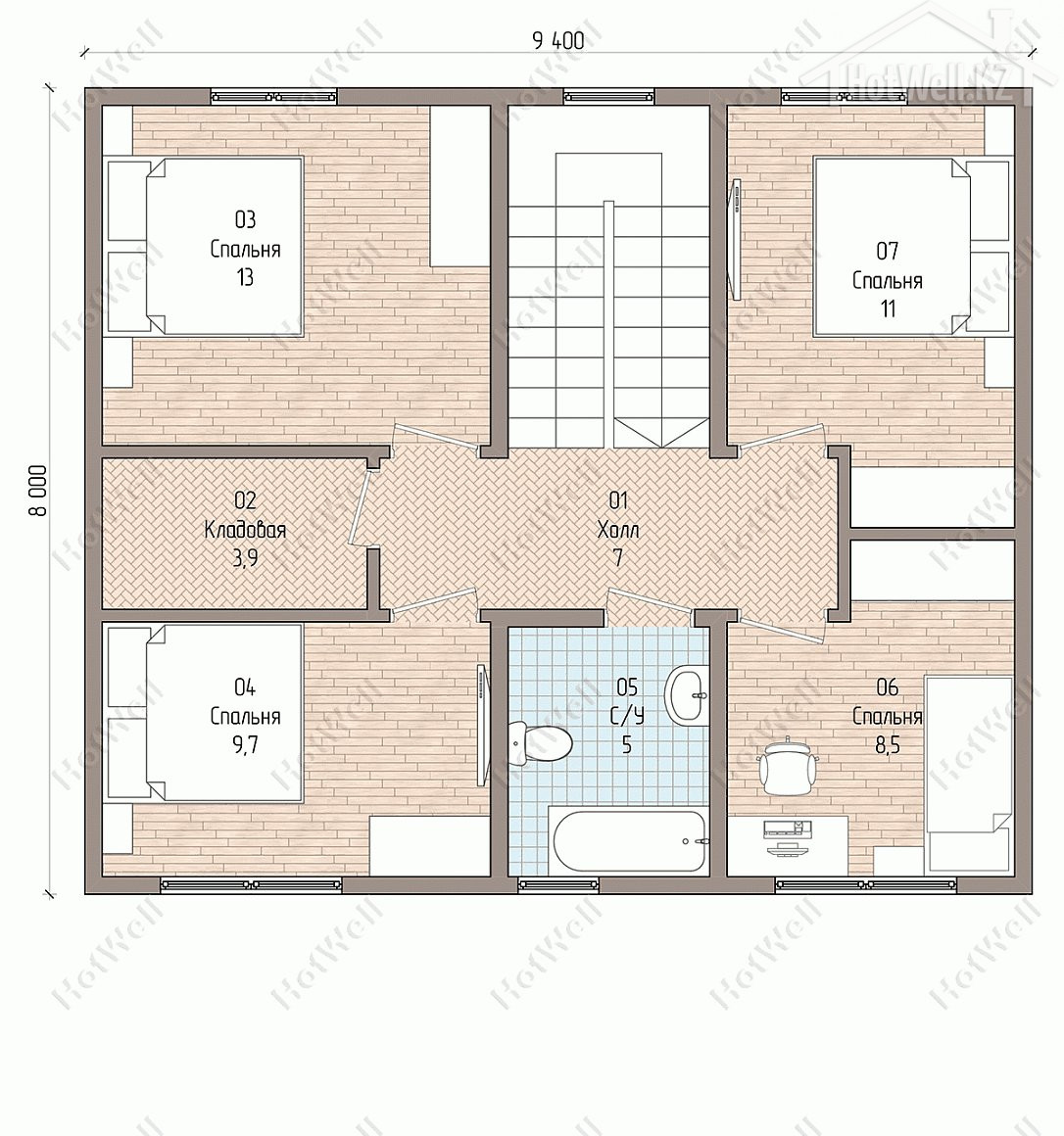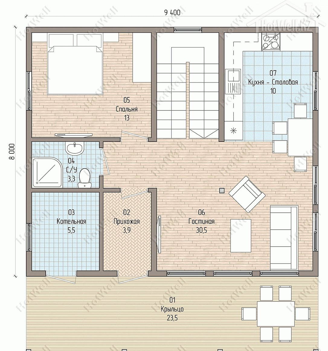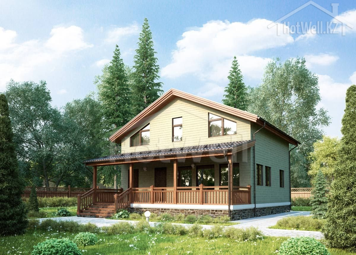 Дом с мансардой 11 на 9 метров, общей площадью 174 м2, из СИП панелей, с бойлерной, террасой и спальней на первом этаже.