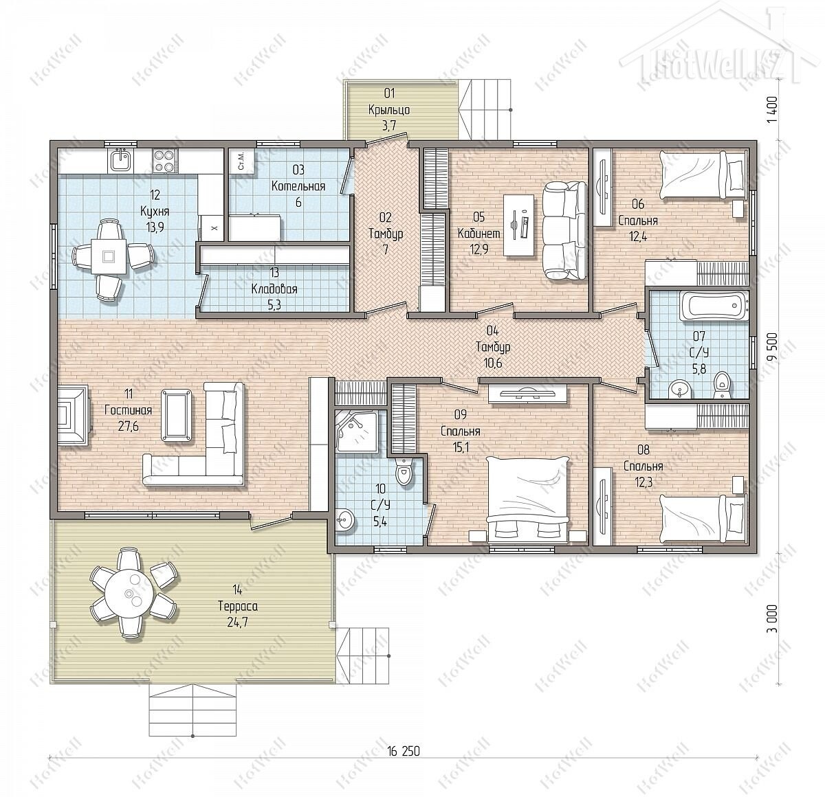 Одноэтажный дом 16 на 14 метров, общей площадью 178 м2, из СИП панелей, с бойлерной, террасой и спальней на первом этаже.