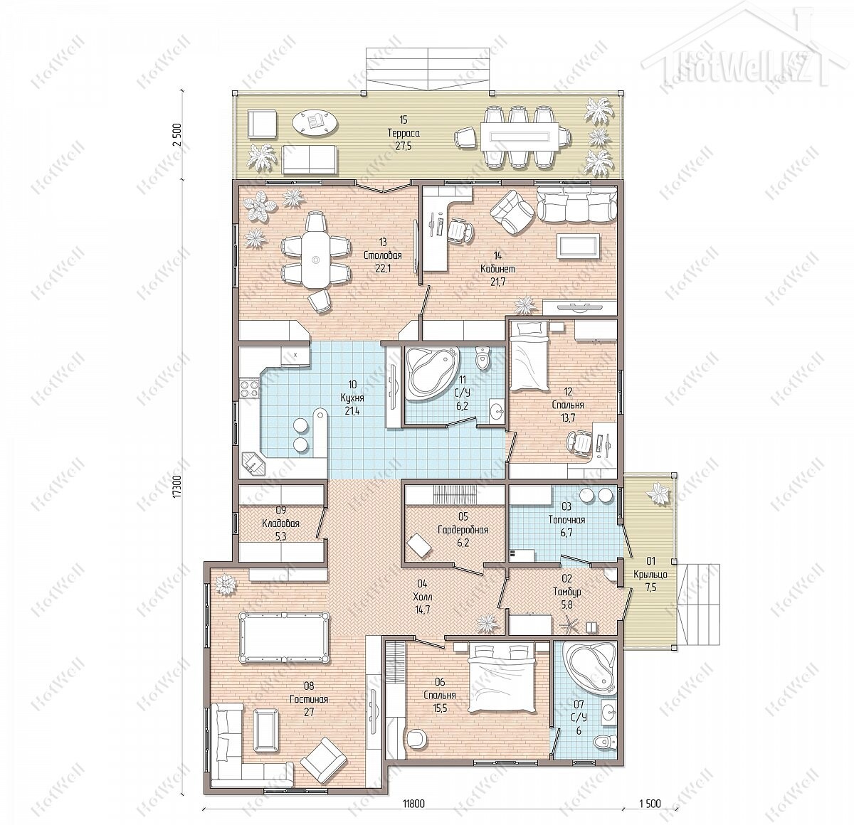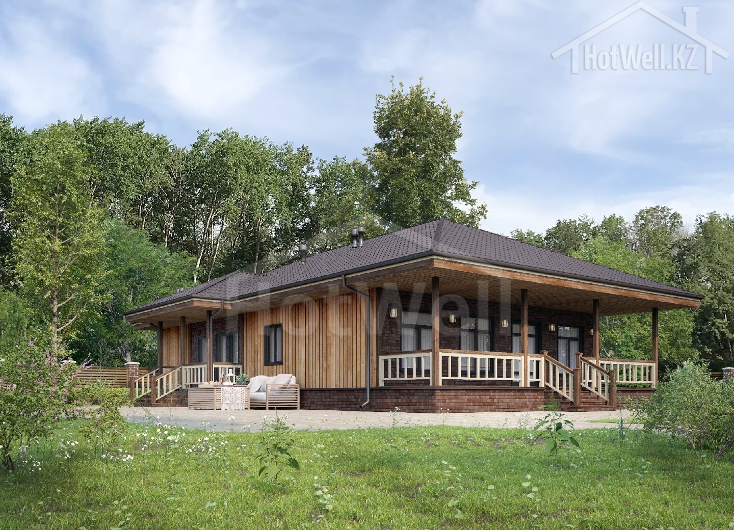Одноэтажный дом 20 на 13 метров, общей площадью 226 м2, из СИП панелей, с бойлерной, террасой и спальней на первом этаже.