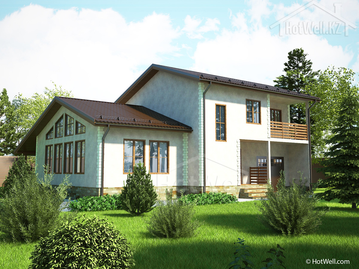 Дом с мансардой 14 на 13 метров, общей площадью 305 м2, из СИП панелей, с бойлерной, гаражом, террасой, балконом, вторым светом и спальней на первом этаже.