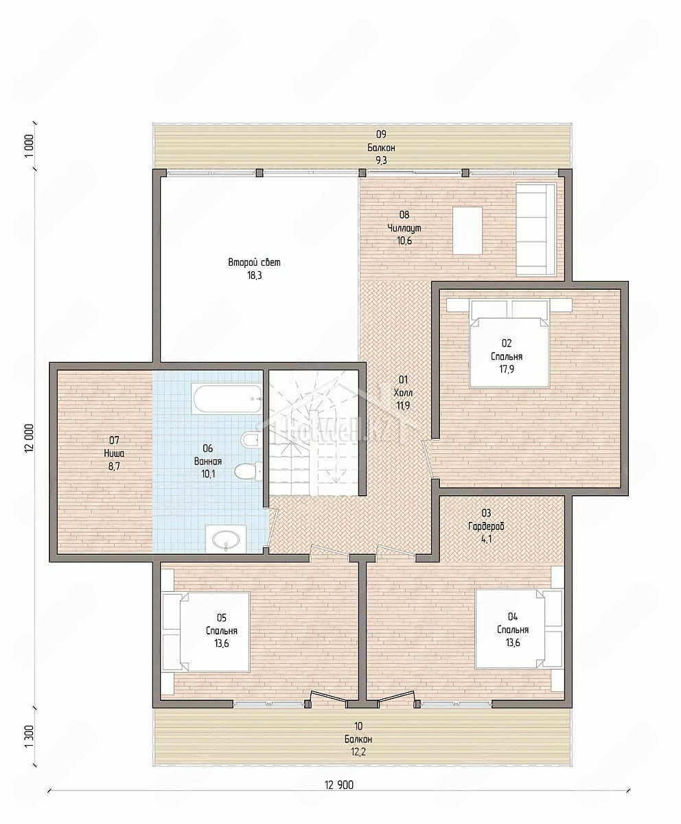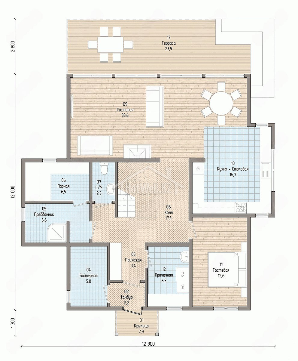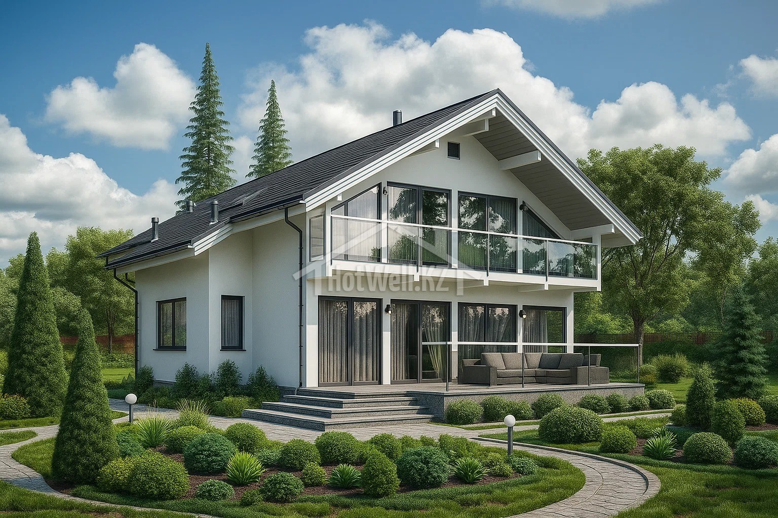 Дом с мансардой 16 на 13 метров, общей площадью 306 м2, из СИП панелей, с сауной, бойлерной, террасой, балконом, вторым светом и спальней на первом этаже.