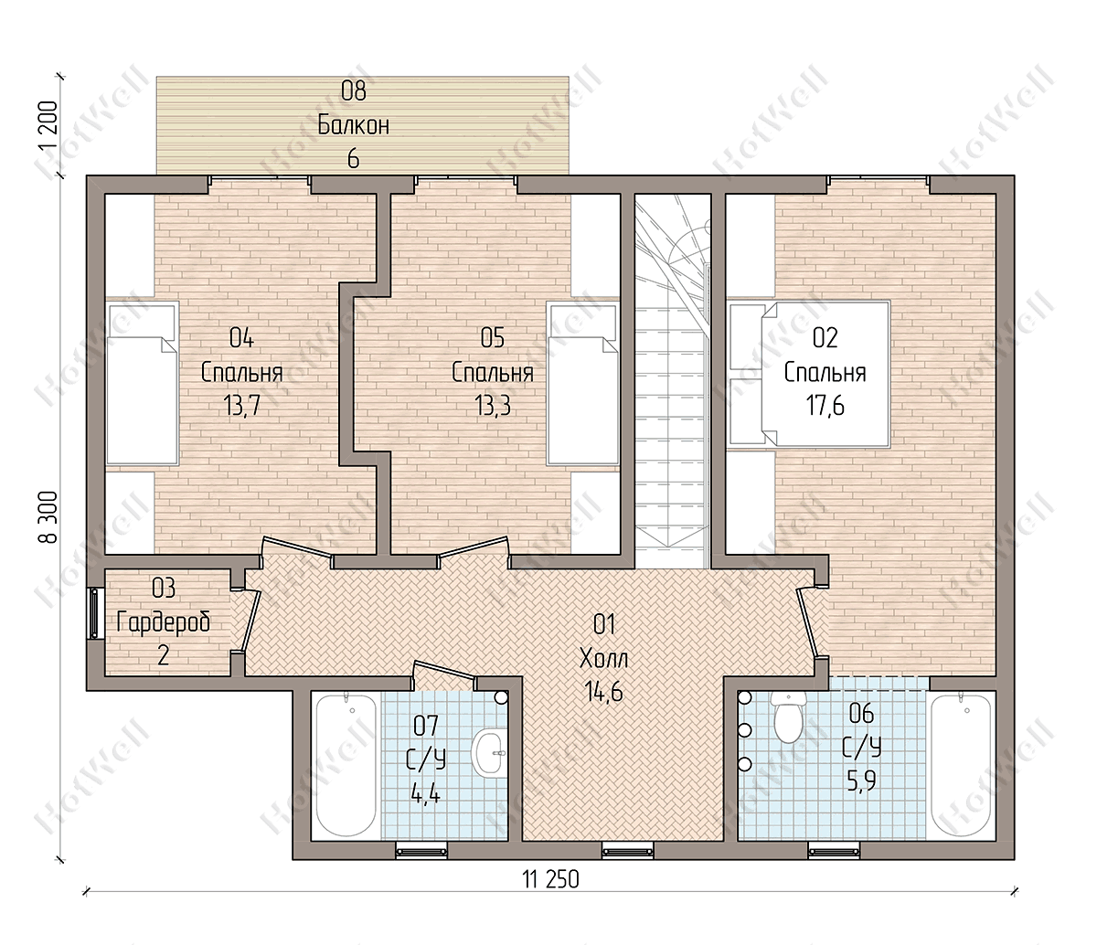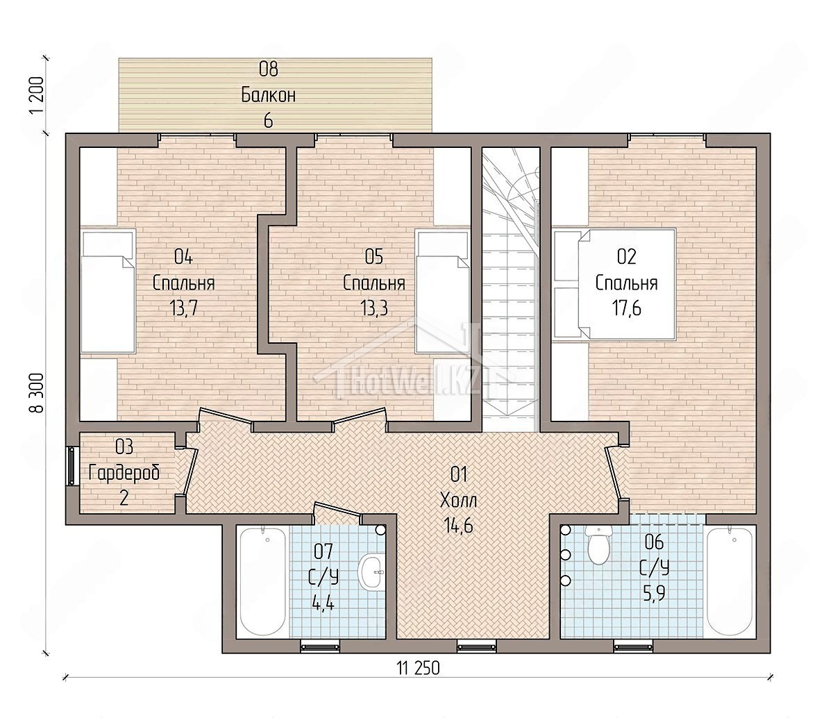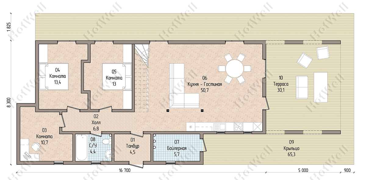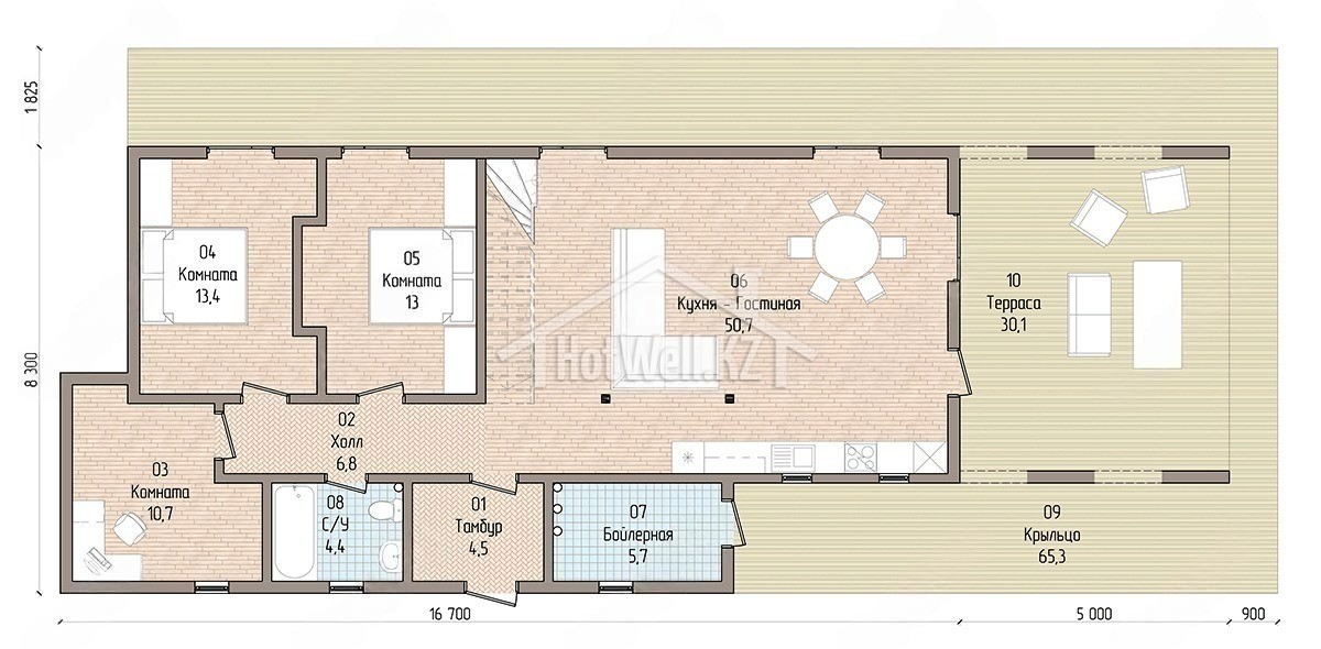 Дом с мансардой 31 на 10 метров, общей площадью 315 м2, из СИП панелей, с бойлерной, террасой, балконом и спальней на первом этаже.