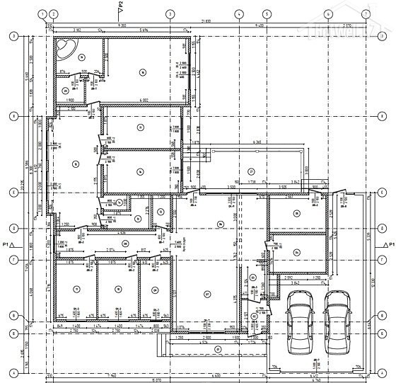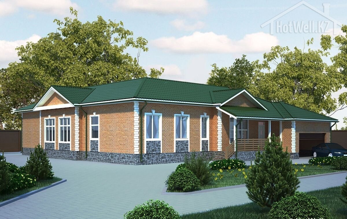 Одноэтажный дом 23 на 22 метров, общей площадью 350 м2, из СИП панелей, с бойлерной, гаражом, террасой и спальней на первом этаже.