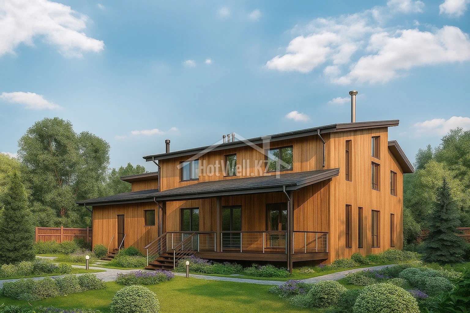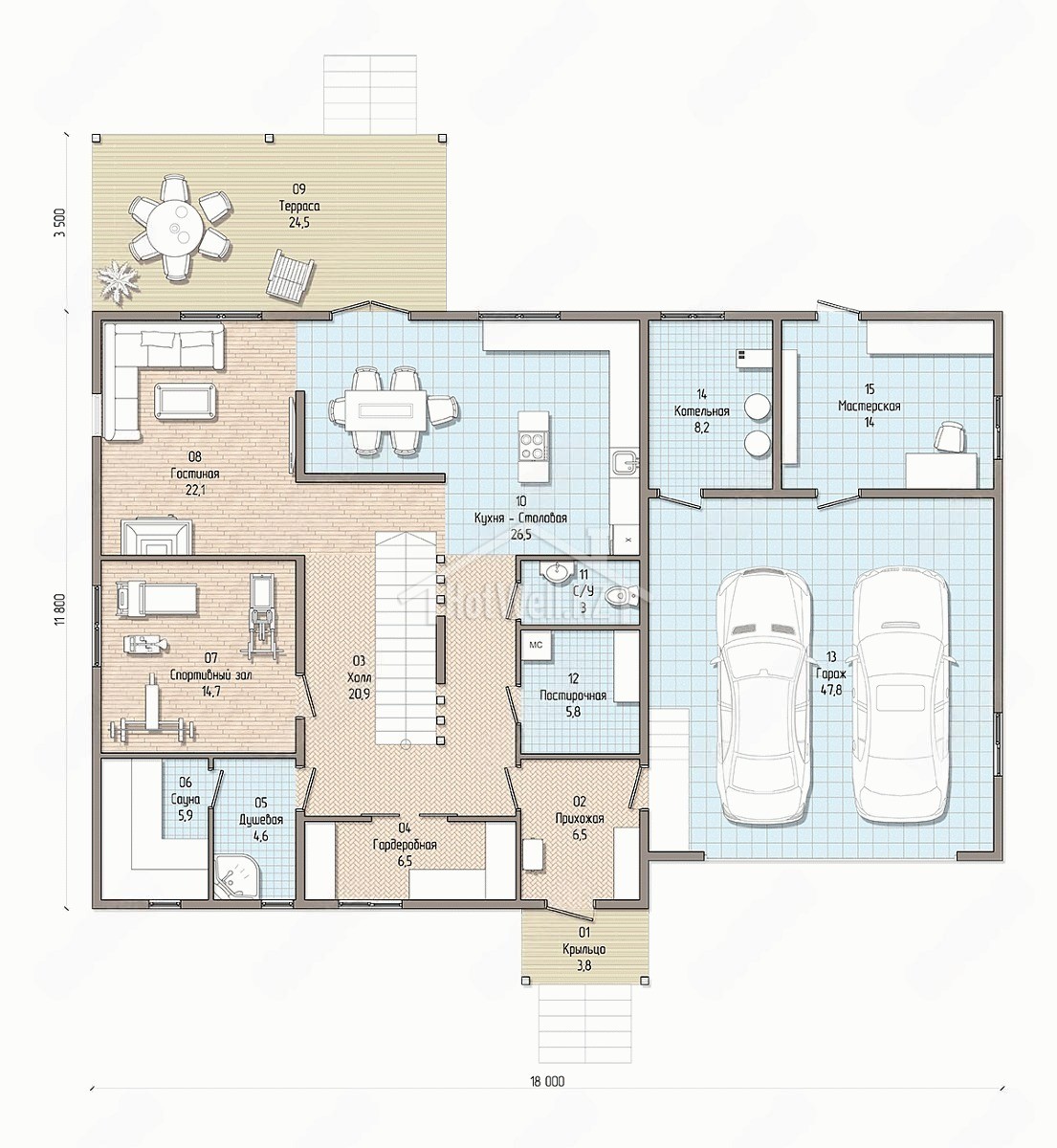 Дом с мансардой 18 на 15 метров, общей площадью 363 м2, из СИП панелей, с сауной, бойлерной и гаражом.