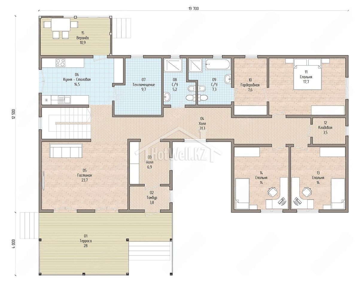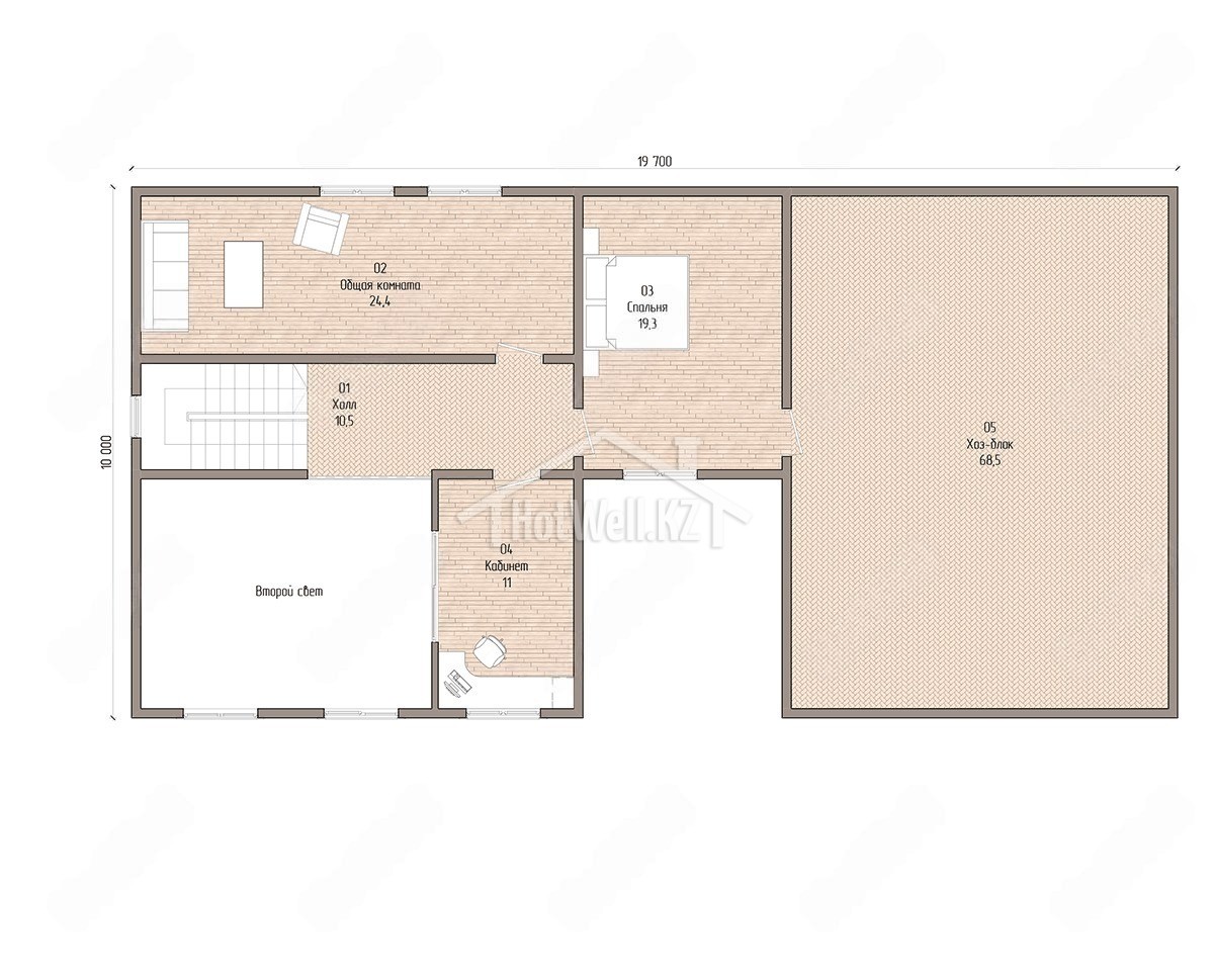 Дом с мансардой 20 на 17 метров, общей площадью 399 м2, из СИП панелей, с бойлерной, террасой, вторым светом и спальней на первом этаже.