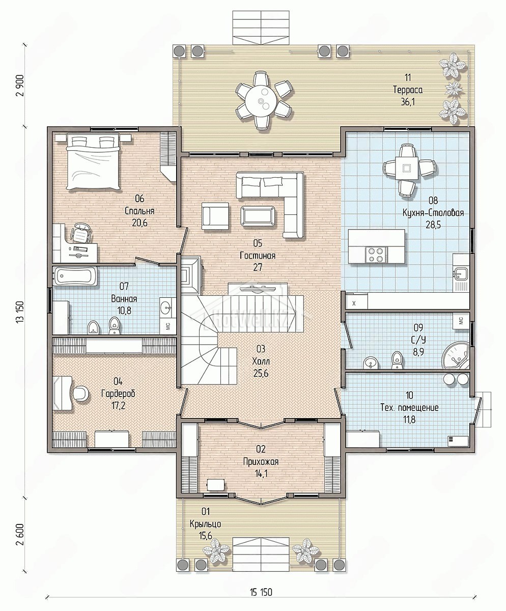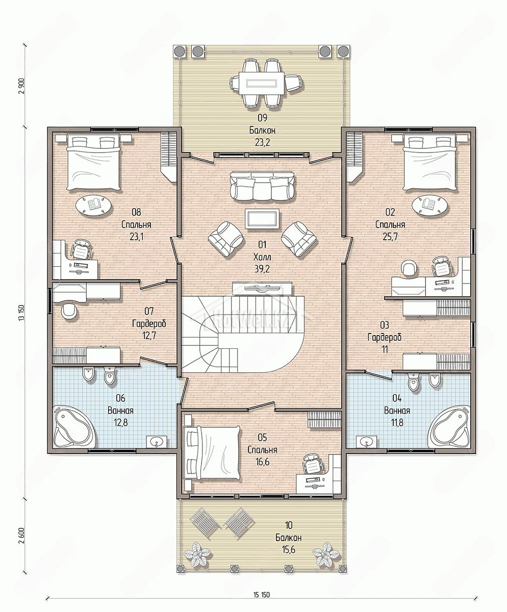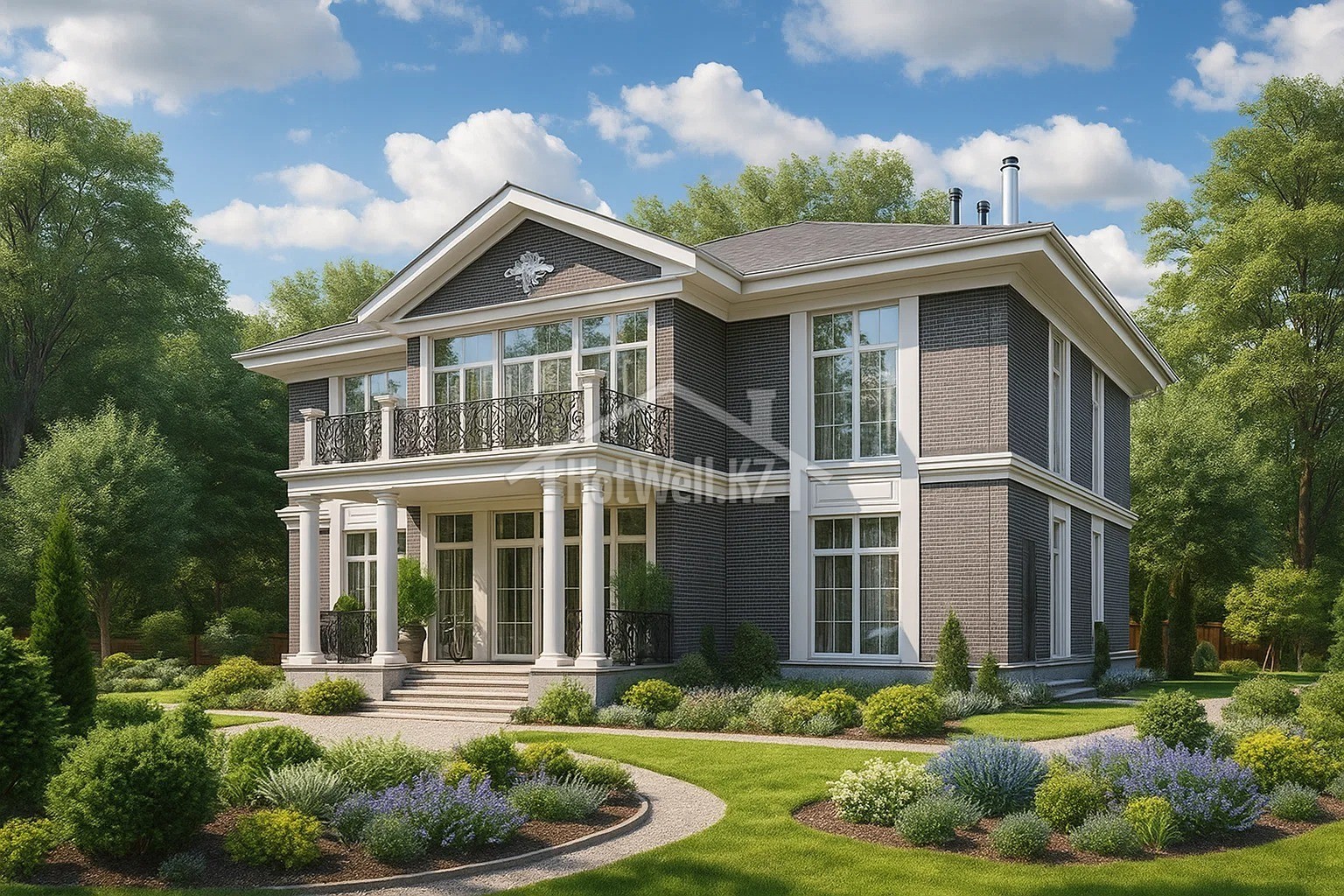 Двухэтажный дом 16 на 15 метров, общей площадью 450 м2, из СИП панелей, с бойлерной, террасой, балконом и спальней на первом этаже.